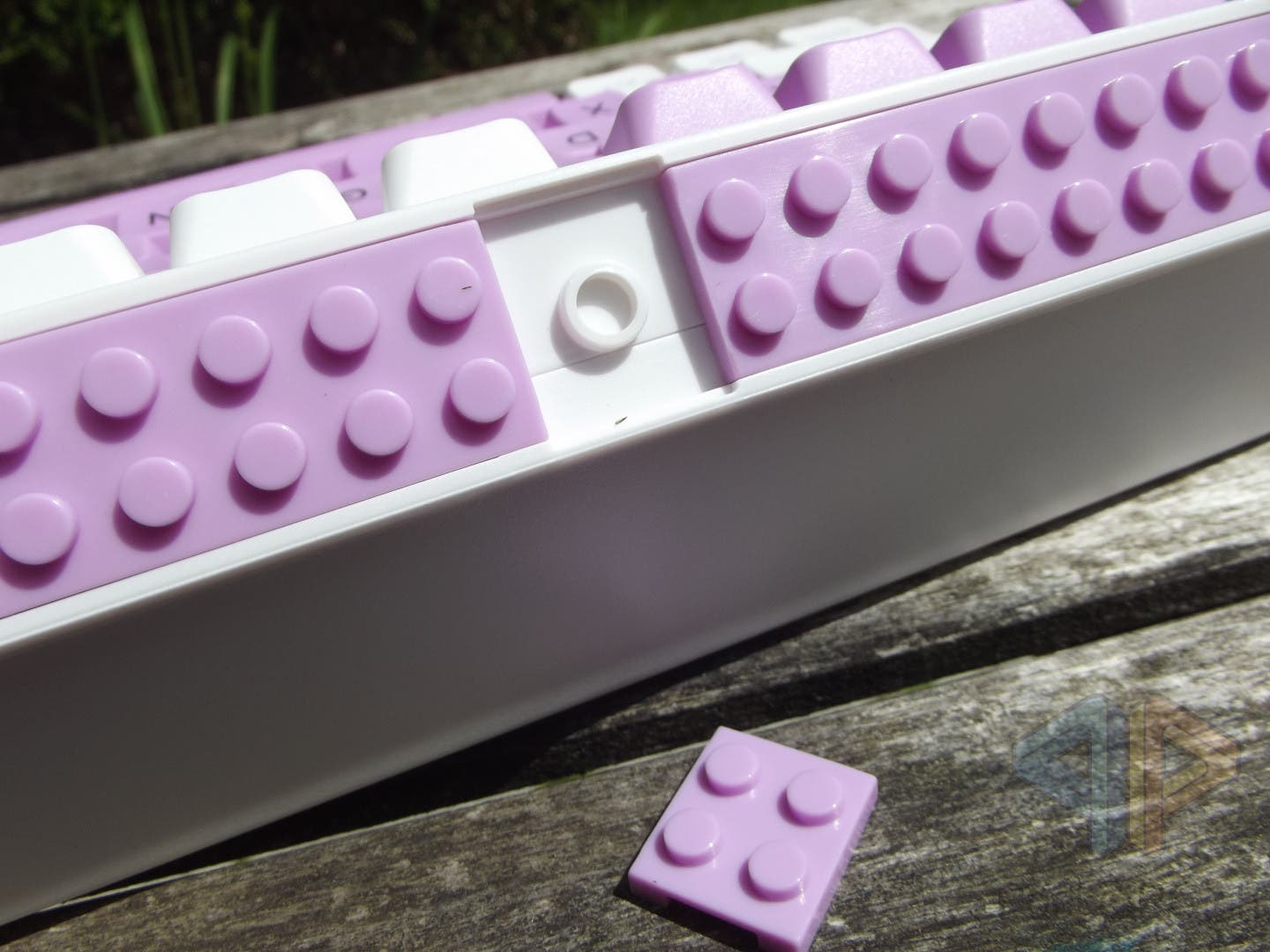 Die Besonderheiten der Tastatur, das 2×2 und 40×2 grosse Noppenfeld, ist in der jeweiligen Akzentfarbe der Tastatur, also grün, rot oder pink, gehalten. Hier können Klemmbausteine und -figuren aufgesteckt werden, was der Tastatur natürlich sehr schnell einen individuellen Touch verleiht. Klar ist das auch etwas verspielt, aber mal ehrlich: Grau ist schon genug. Jeweils zwei 2×2 Felder dieser Reihe sind zudem abnehmbar, wobei die darunterliegenden Noppen nicht kompatibel sind zu vielen anderen Steinen und auch die abgenommenen Felder nicht auf die restliche Reihe gesteckt werden können.