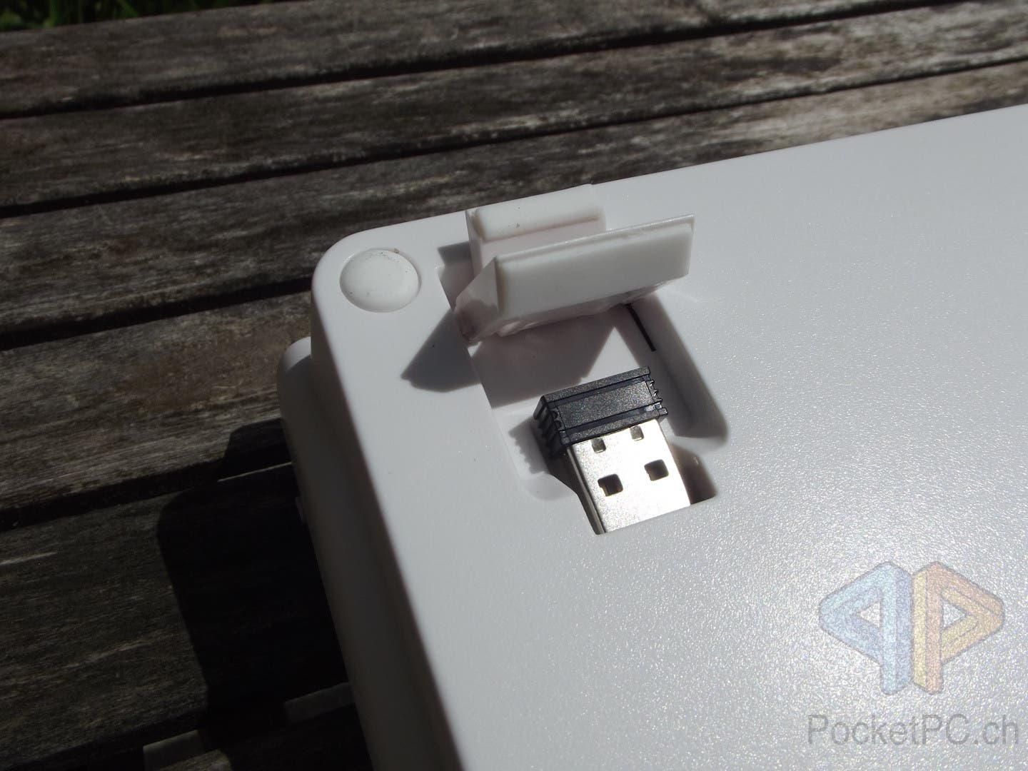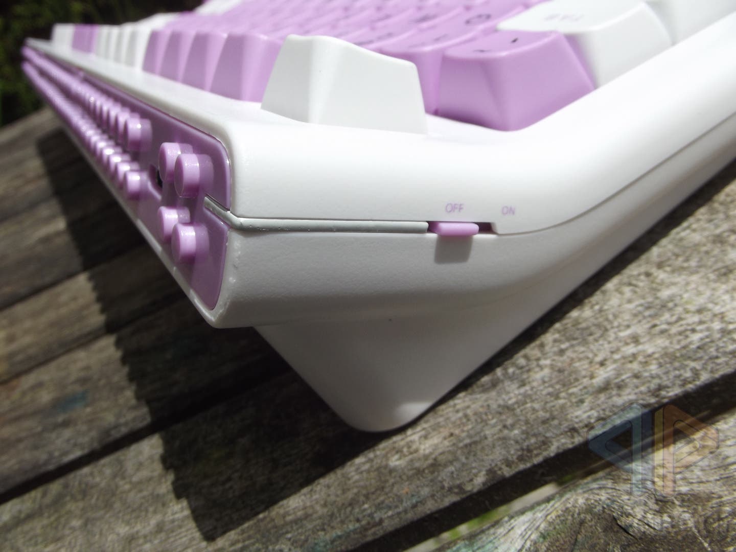 Auf der linken Seite ist ein Ein-Aus-Schiebeschalter verbaut, wobei dieser ungewohnt nach oben geschoben wird, um die Tastatur auszuschalten. Auf der rechten Seite ist der Schiebeschalter für den Verbindungsmodus zu finden. Mit dessen Hilfe kann man zwischen Bluetooth, USB und kabellos auswählen, wobei die Tastatur im USB-Modus natürlich den internen Akku nicht zur Stromversorgung nutzt, sondern vom Rechner gespeist wird. Es können bis zu drei Geräte gleichzeitig per Bluetooth gekoppelt werden.