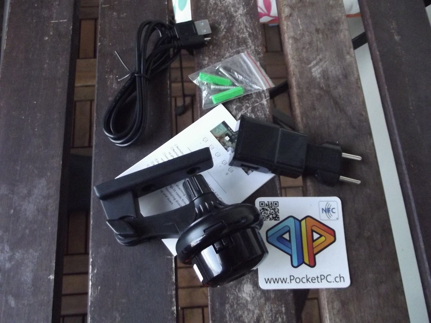 Geliefert wird die ESCAM Button Q6 IP-Cam mit englischer Kurzanleitung, microUSB-Kabel und Netzteil, Halterung, passenden Schrauben und Dübeln. Die nur 82 Gramm leichte Kamera hat eine 3.6 mm f/2.0 Linse und einen 1/4 Zoll grossen CMOS-Sensor mit 720p Auflösung. Sie besitzt ein eingebautes Mikrophon, 1 Watt-Lautsprecher, 10 Infrarot-LED für die Nachtsicht, die ringförmig um die Linse angeordnet sind, einen microSD-Slot für Speicherkarten bis 128 GB und wird per microUSB-Anschluss mit Strom versorgt. Letzteres ist beides seitlich am runden Kameragehäuse zu finden, dass einen Durchmesser von 55 mm aufweist. Das Gadget verbindet sich per WLAN 802.11 b/g/n mit dem Internet und ist per kostenloser App für Android und iOS ansteuerbar.