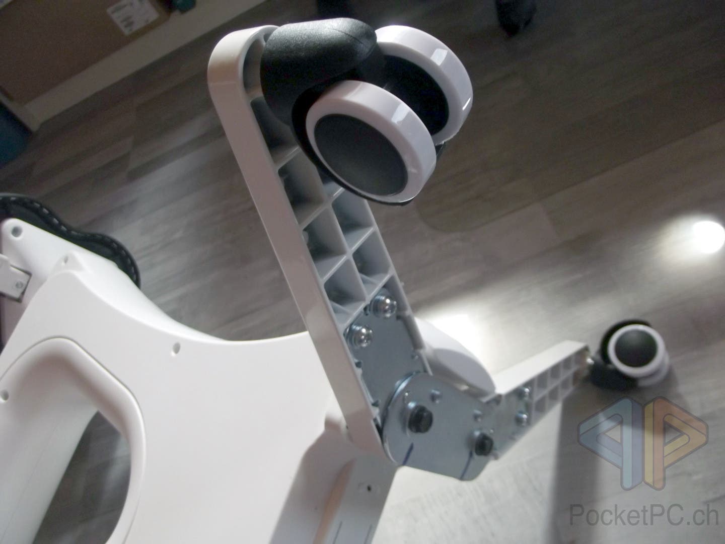 Das FlexiSpot V9U Desk Bike ist 95.5 x 58 x 75.2 cm gross und kann bis 94.5 cm erhöht werden, indem der stufenlose Sattel verstellt wird. Es ist ingesammt knapp 28 kg schwer. Die vier Beine mit den Rädern können zum Verstauen übrigens wieder eingeklappt werden, indem mit dem mitgelieferten Inbusschlüssel, oder einem anderen harten Gegenstand, kräftig auf die Federsicherungen an der Unterseite gedruckt wird. So kann das Desk Bike dann einfach weggestellt werden.
