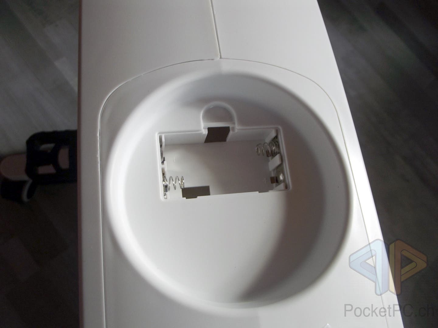 Gleich darüber ist ein kreisrundes Fach von 9 cm Druchmesser und knapp 1.5 cm Höhe zu finden, dass als Getränkehalter dient. Darin ist ein Batteriefach für zwei handelsübliche AA-Batterien, die das Display mit Strom versorgen. Ohne Strom kann aber das FlexiSpot Deskcise V9U ebenfalls problemlos benutzt werden. Nur zeigt es dann eben keine Werte an.