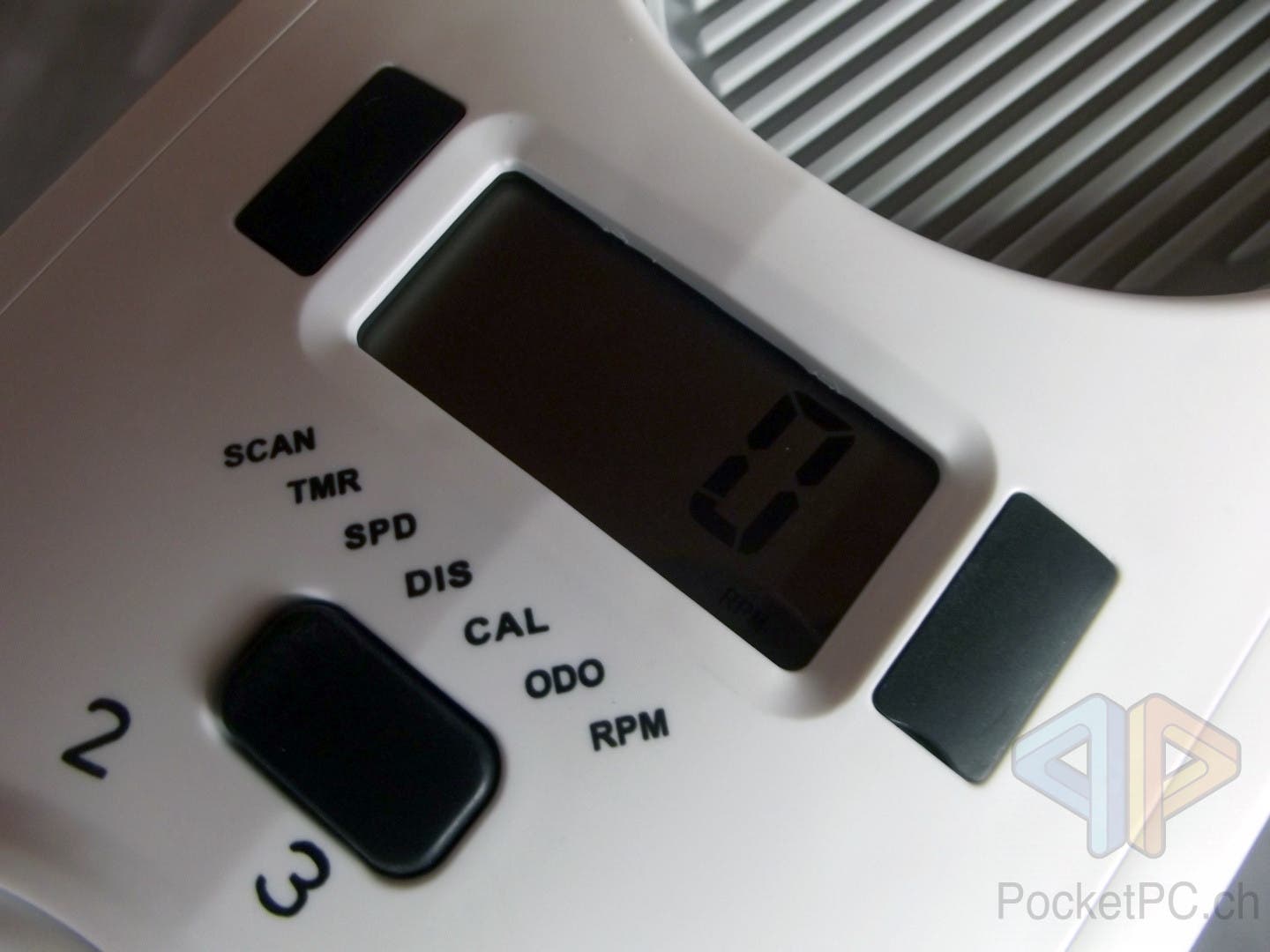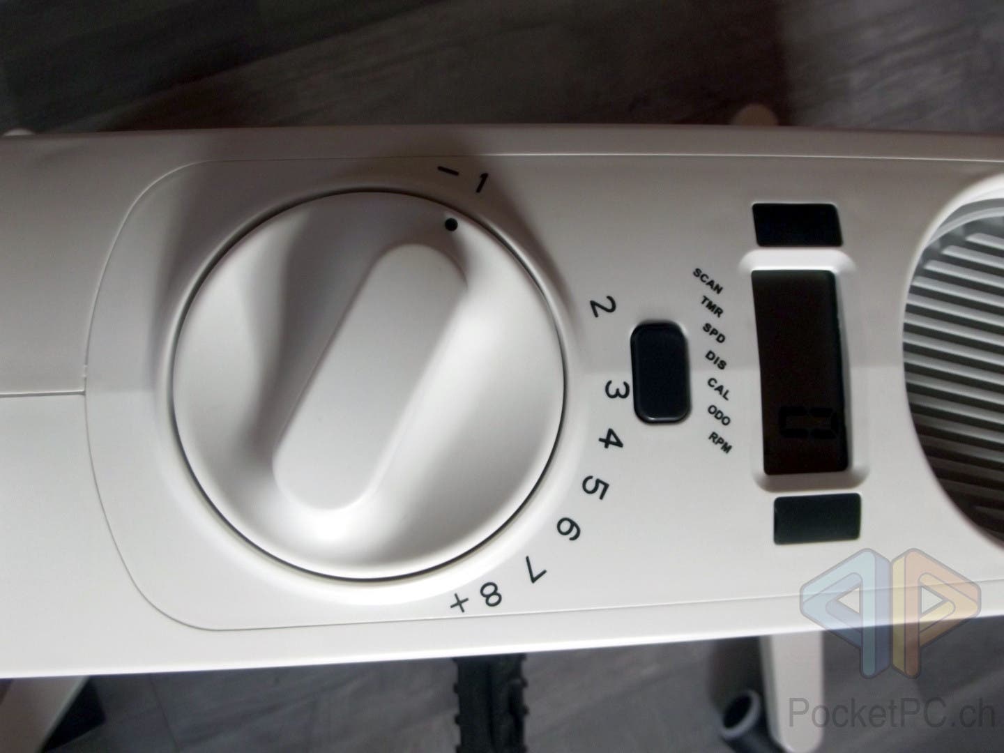 Vor dem Rad für die Einstellung der Intensität ist eine schwarze Taste und ein LCD zu finden. Die beleuchtete Flüssigkristallanzeige stellt die Trainingszeit, die zurückgelegte Distanz, die Geschwindigkeit, die verbrauchten Kilokalorien und Geschwindigkeit des Schwungrades und die Gesamtdistanz (Odometer). Zwischen den angezeigten Werten wird mit der Taste gewechselt, oder aber die Scan-Einstellung gewählt, die selbstständig all fünf Sekunden die Anzeige umschaltet.