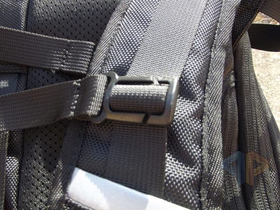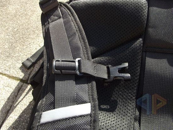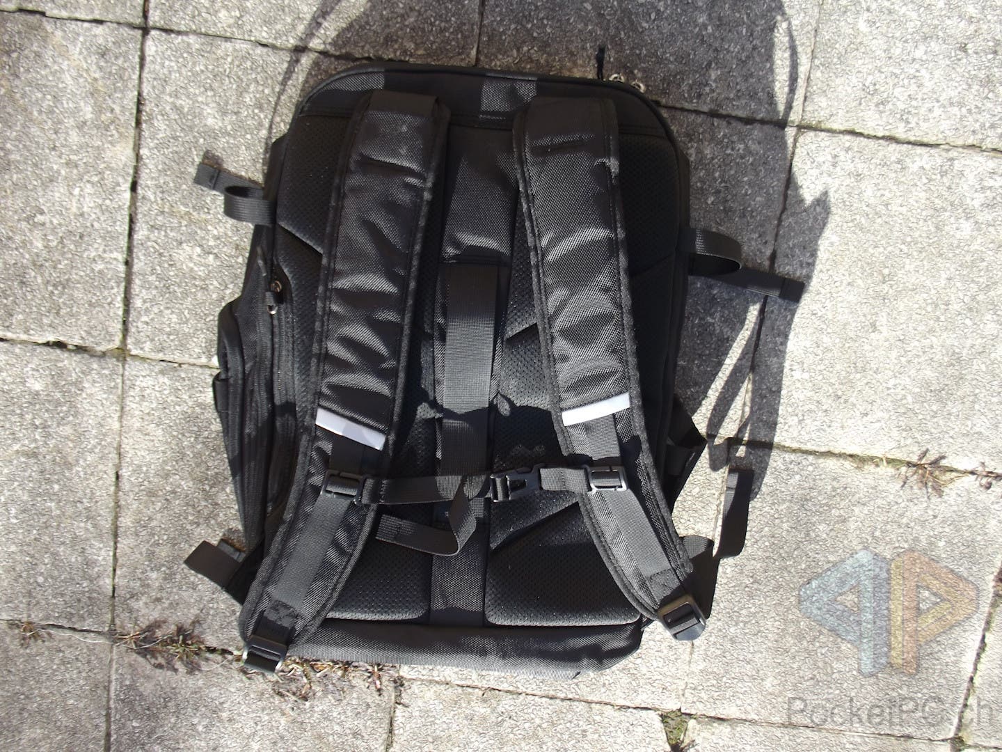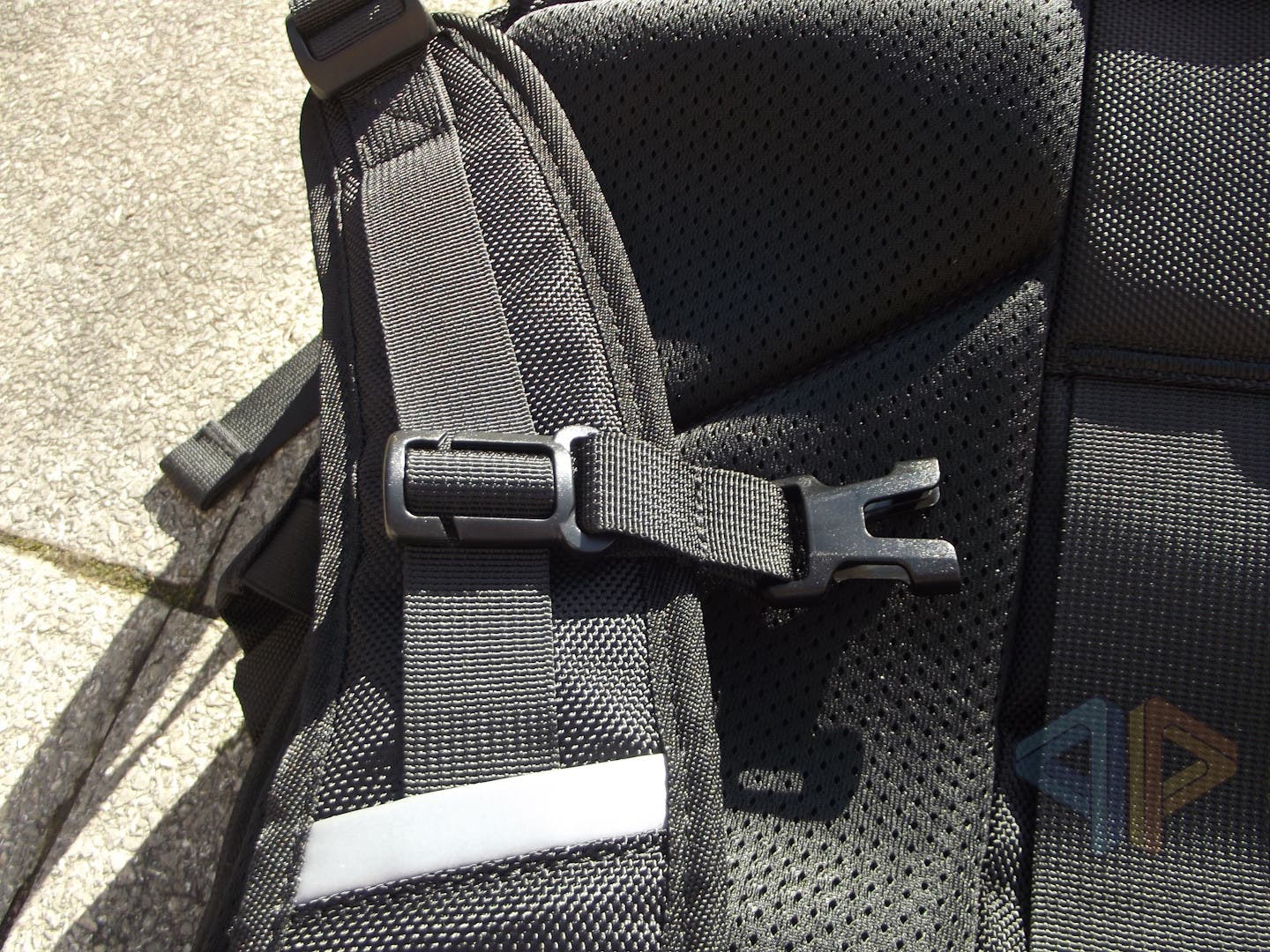 Das gepolsterte Teil am Rücken ist mit einem Netz versehen, welches für einen angenehmeren Tragekomfort sorgt. Ferner lässt sich der Brustgurt anpassen, um die Stabilität des Rucksacks zu verbessern, besonders wenn er stark beladen ist. Für eine bessere Sichtbarkeit unter schlechten Lichtbedingungen sind auf den Schultergurten reflektierende Bänder angebracht.