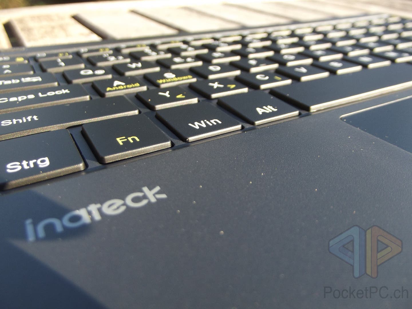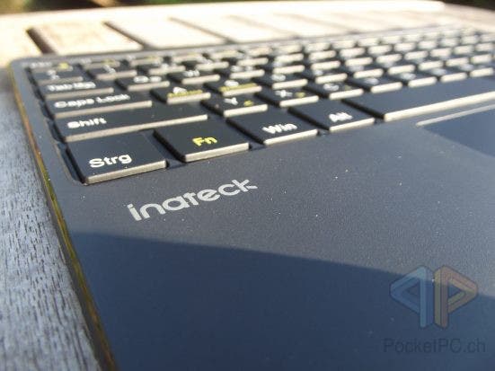 Die Inateck Tablet Bluetooth-Tastatur wiegt 327 Gramm und ist 252 x 175 x 5 mm gross. Die Tastatur KB01101 verfügt über 80 Tasten, wobei neben den üblichen Buchstaben von A bis Z sowie Umlaut-Tasten und den Satzzeichen-Tasten auch alle zwölf F-Tasten sowie vier Pfeiltasten in handelsüblicher, umgedrehter T-Anordnung in der unteren, rechten Ecke zu finden sind. Links unten befindet sich zwischen Strg und einer Windows-Taste die Fn-Taste. Mittels Fn-Taste werden die neongelben Funktionen der Tastatur bedient. Neben den F-Tasten und Bildlauf wird so auch das Bluetooth-Pairing aktiviert und die Belegung für Windows (Fn + S ) oder für Android (Fn + A) einzurichten. Damit werden auch die Gesten für das Touchpad umgestellt.