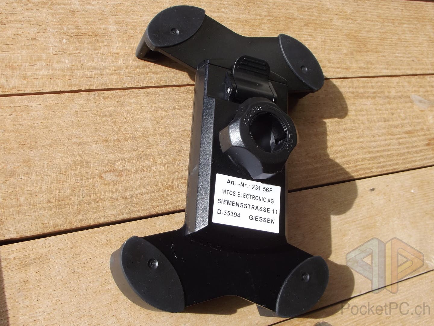 Die Halterung selbst ist aus schwarzem Kunststoff und in Form eines X in der Grösse von 95 x 51 x 139 mm, wobei die vier abgerundeten Enden voll gummiert sind und eine ca. 10 mm überstehende Kante besitzen.