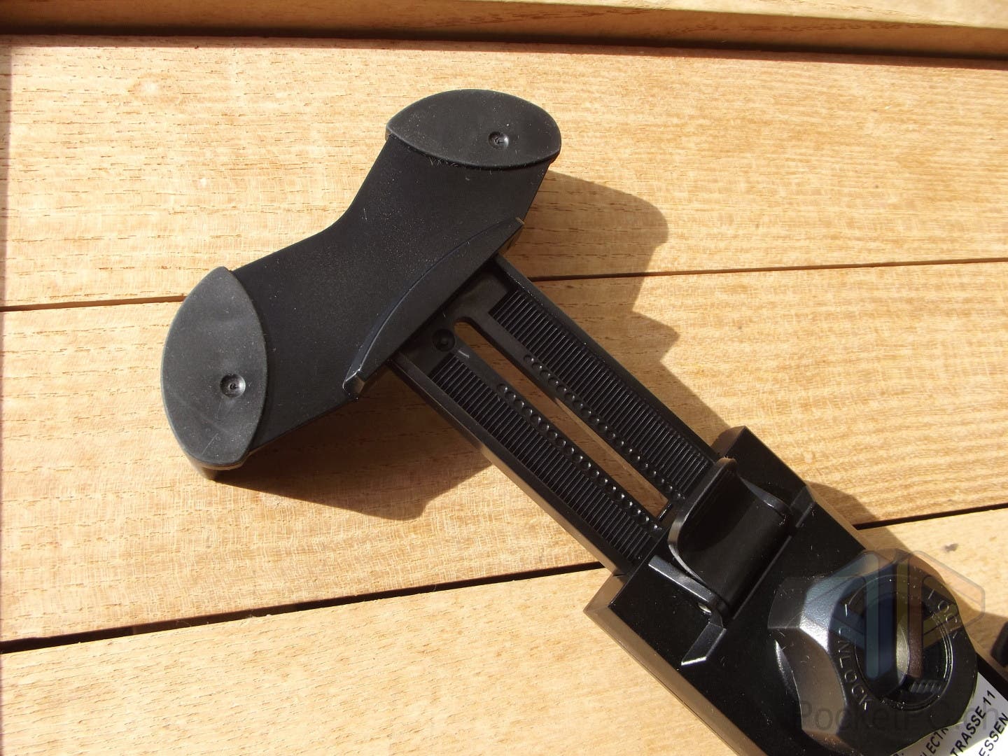 Auf der Rückseite wird der ausziehbare Arm mittels Hebel arretiert und sichert das Handy so. Mittig ist ein Kugelgelenk mit Überwurfmutter zu finden.