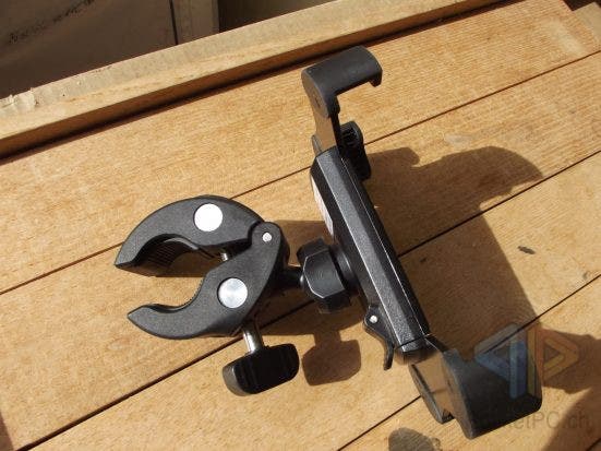 Die mitgelieferte Klemme wiegt 117 Gramm und ermöglicht die Befestigung an Stangen von 18 bis 40 mm Durchmesser. So kann die Universalhaltung an Lenkern von Fahrrädern, E-Scootern und Kinderwagen genauso angebracht werden wie an der Kopfstütze im Auto. Damit eignet sich die InLine One Click Easy Drive & Ride 3 auch für das Bord-Entertainment im Fonds. Durch die dick gummierten Backen der Klammer werden nicht nur die Stangen geschont. Auf der Oberseite ist eine grosse Flügelschraube zum Feststellen der Klemme. Die Halterung ist so auch rutschsicher an glatten Lenkern zu befestigen.