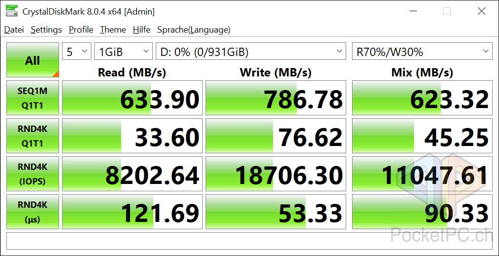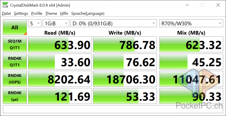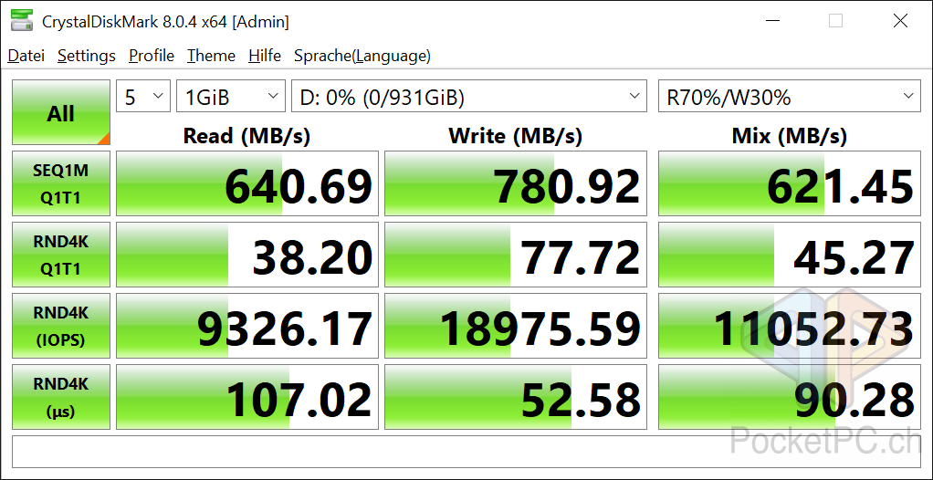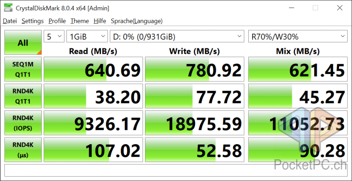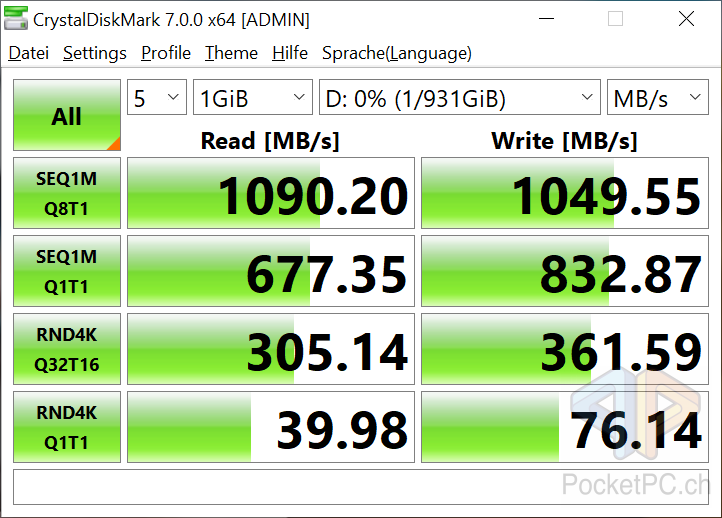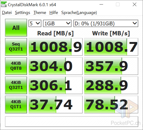 Der mittig auf der kurzen Seite angebrachte USB-C-Anschluss lässt sich gut finden und einfach benutzen und da er eben auf der Seite anliegt, können auch breite USB-C-Kabel eingesteckt werden. Dank USB 3.2 Gen. 2 sind die Übertragungsraten auch potentiell schnell genug. Die versprochenen Datenraten hält die EXCERIA PLUS in den Tests von CrystalDiskMark einigermassen ein.
