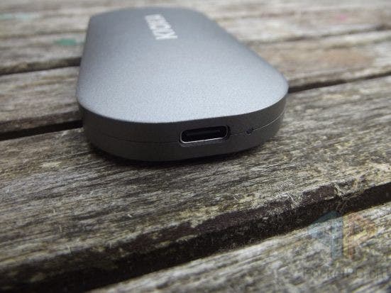 Die EXCERIA PLUS Portable SSD von Kioxia macht einen hochwertigen und robusten Eindruck, was nicht zuletzt dem Aluminiumgehäuse geschuldet ist. Es bringt ein angenehm leichtes Gewicht auf die Wage und liegt durch seine ovale Form gut in der Hand. In der Mitte ist die SSD 14.7 mm dick, verjüngt sich jedoch zu allen Rändern. Am äusseren Rand misst die EXCERIA PLUS SSD nur noch 8.5 mm. Darum ist sie aber auch auf der Unterseite nochmal abgeflacht, um plan aufliegen zu können.