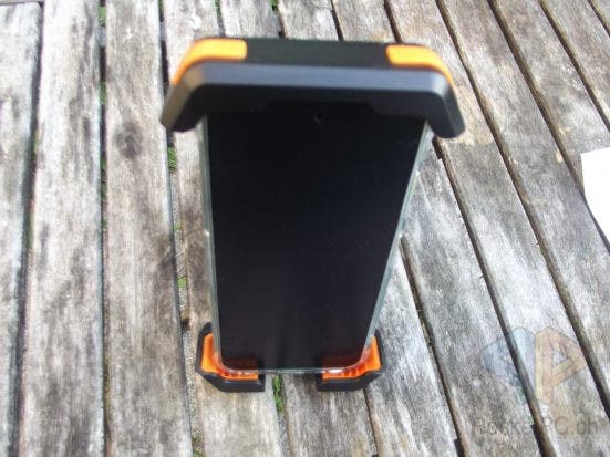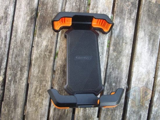 Die Handyhalterung misst 14 x 8 x 6 cm und wiegt 215 Gramm. Sie besteht aus einer rechteckigen Halterung aus Aluminium mit Gummieinlagen, in das Handys von 4.7 Zoll bis 7.2 Zoll passen. Auf der Rückseite ist ein roter Hebel, der die Halterung arretiert. Darunter ist die Aufnahme für die Lenkerklammer. Diese wird von vier breiten Gummidämpfern abgefedert.