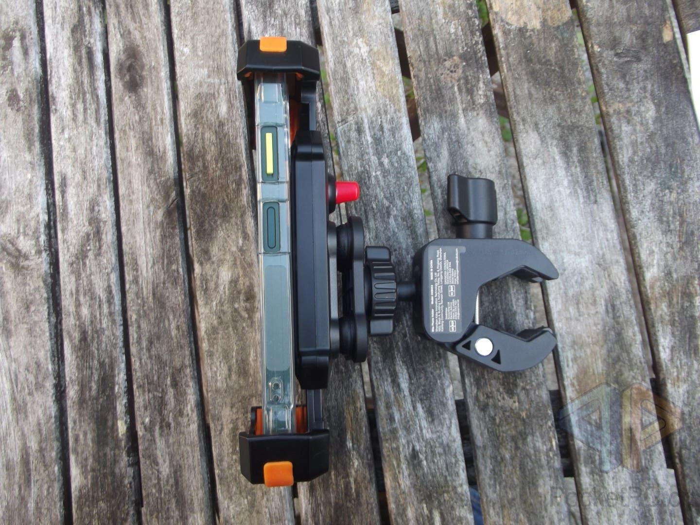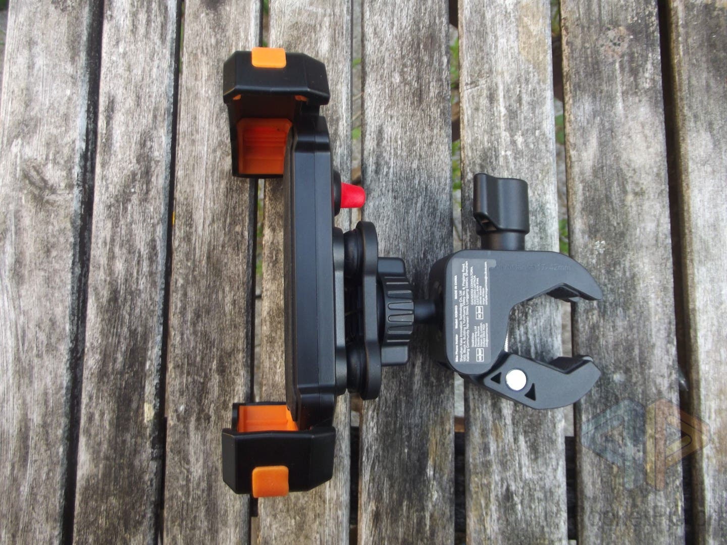Die Lenkerklammer selbst kommt ebenfalls aus Metall daher mit einer klassischen C-Klammer und wird mittels grosser Flügelmutter festgestellt. Der Kugelkopf der Halterung wird in der Halterung durch eine Mutter arretiert. Die Klammer passt an Lenker von 17 mm bis 42 mm und kann beliebig verstellt werden. Auch dieser ist mit Gummipolstern ausgestattet. Laut Hersteller ist die Halterung für Geschwindigkeiten bis 120 km/h ausgelegt.