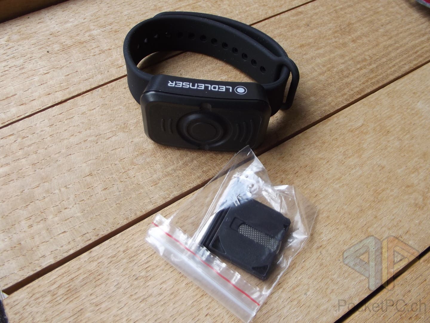 Die mitgelieferte Fernbedienung besteht aus einem 43 x 10 x 27 mm grossen und 15 Gramm leichten Gadget mit Armband (ebenfalls 15 Gramm leicht), dass die drei Tasten des Lampenkopfs repliziert. Zudem verfügt sie auf der Oberseite über eine LED zur Batteriestandsanzeige. Wechselt diese von Grün auf Rot sind weniger als 10 Prozent Ladung in der Knopfzelle vorhanden. Die Fernbedienung ist insofern praktisch, als dass der Lampenkopf durchaus unangenehm heiss wird im Betrieb.