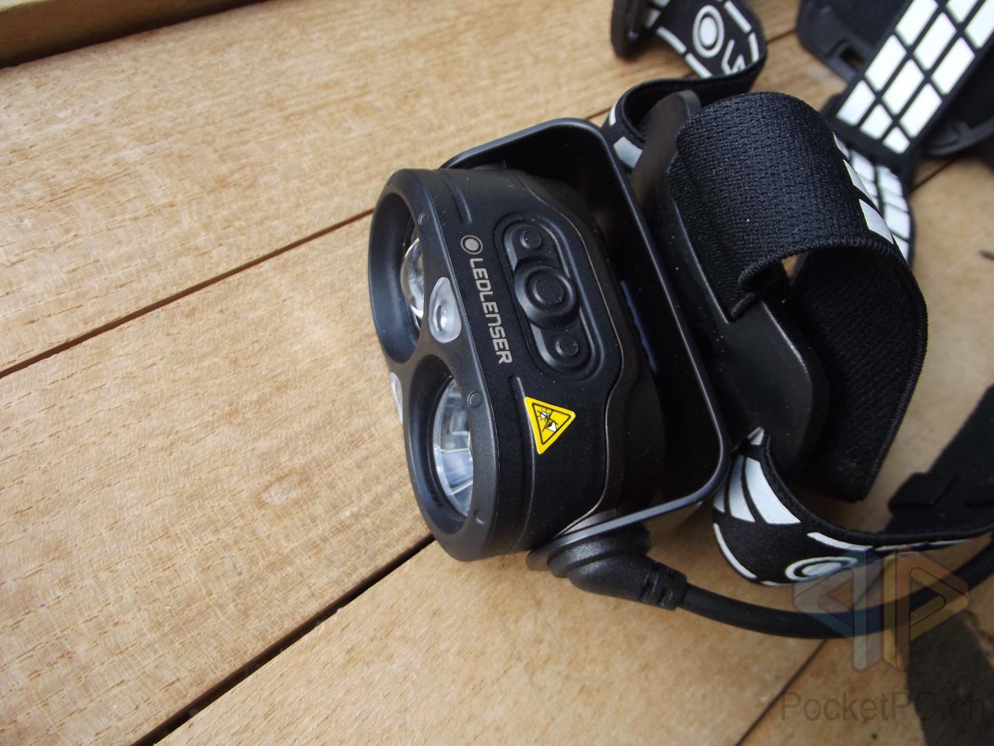 Die Stirnlampe H19R von Ledlenser selbst fällt durch den 67 x 37 x 48 mm grossen und 125 Gramm leichten Lampenkopf auf, der sowohl ein Flutlicht-Strahler als auch ein Spot-Licht enthält. Beide sind hinter grossen bruchfesten Glaslinsen verbaut und separat ansteuerbar. Dazu findet sich oben auf dem Lampenkopf ein Bedienfeld mit drei mechanischen Tasten. Die Mittlere schaltet beide gleichermassen ein und regelt deren Helligkeit in drei Stufen. Ein Doppelklick der mittleren, grossen Taste schaltet beide Lampen in den Boost-Modus auf maximale Helligkeit für 10 Sekunden.