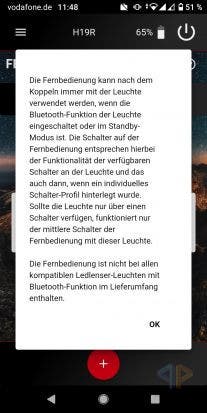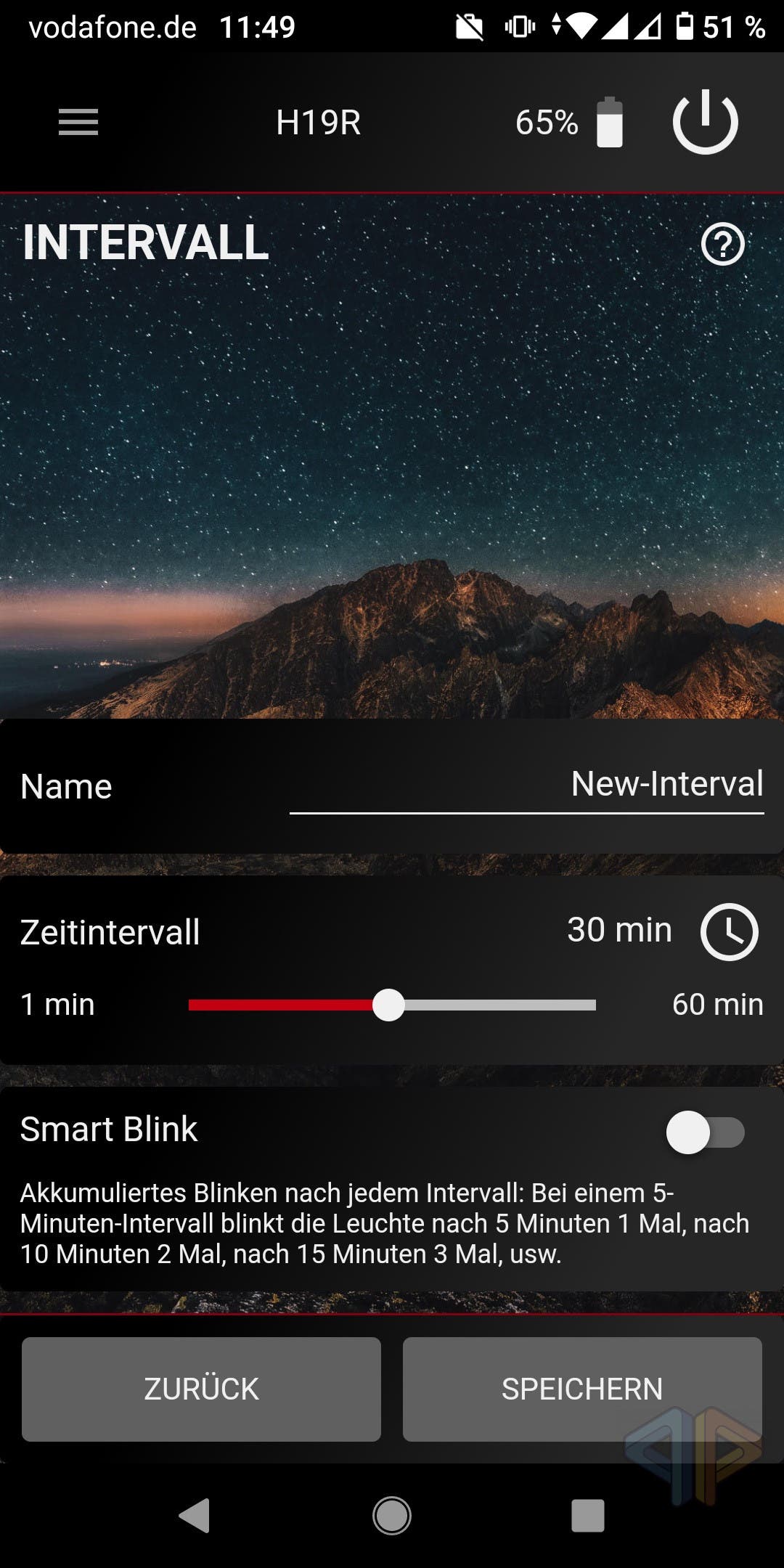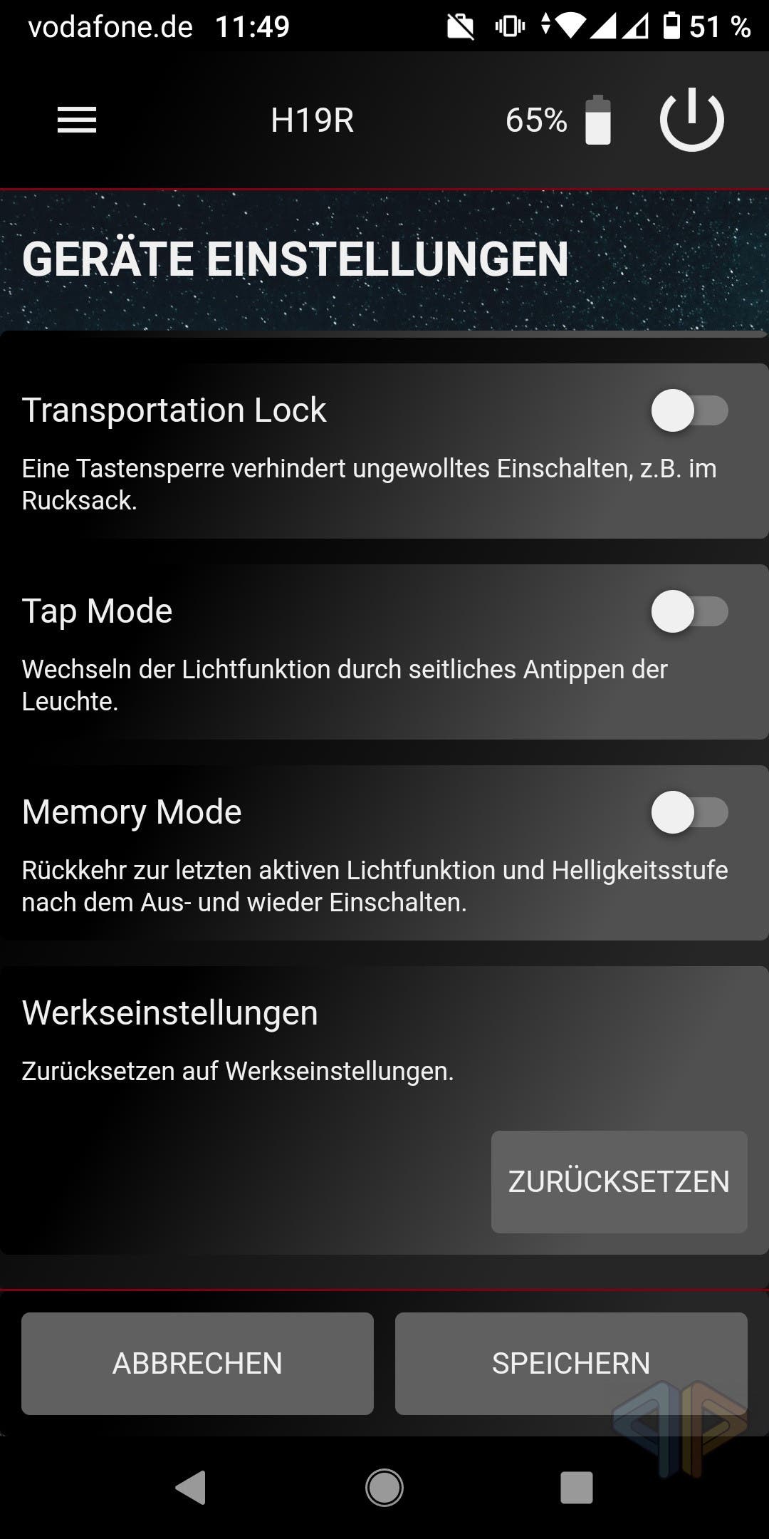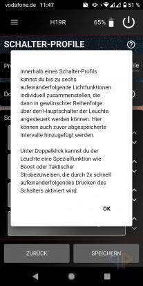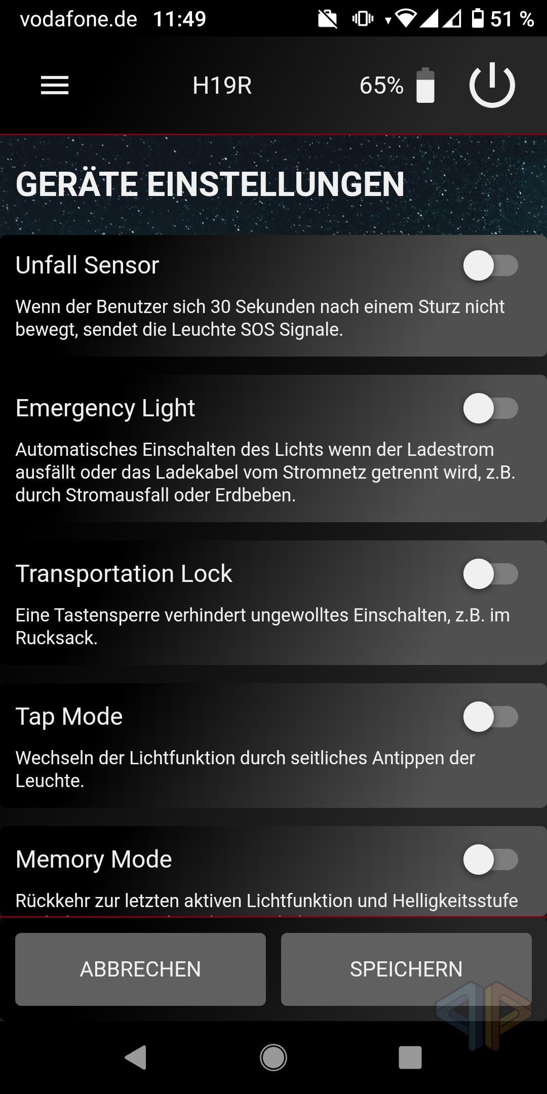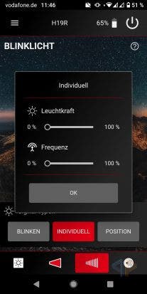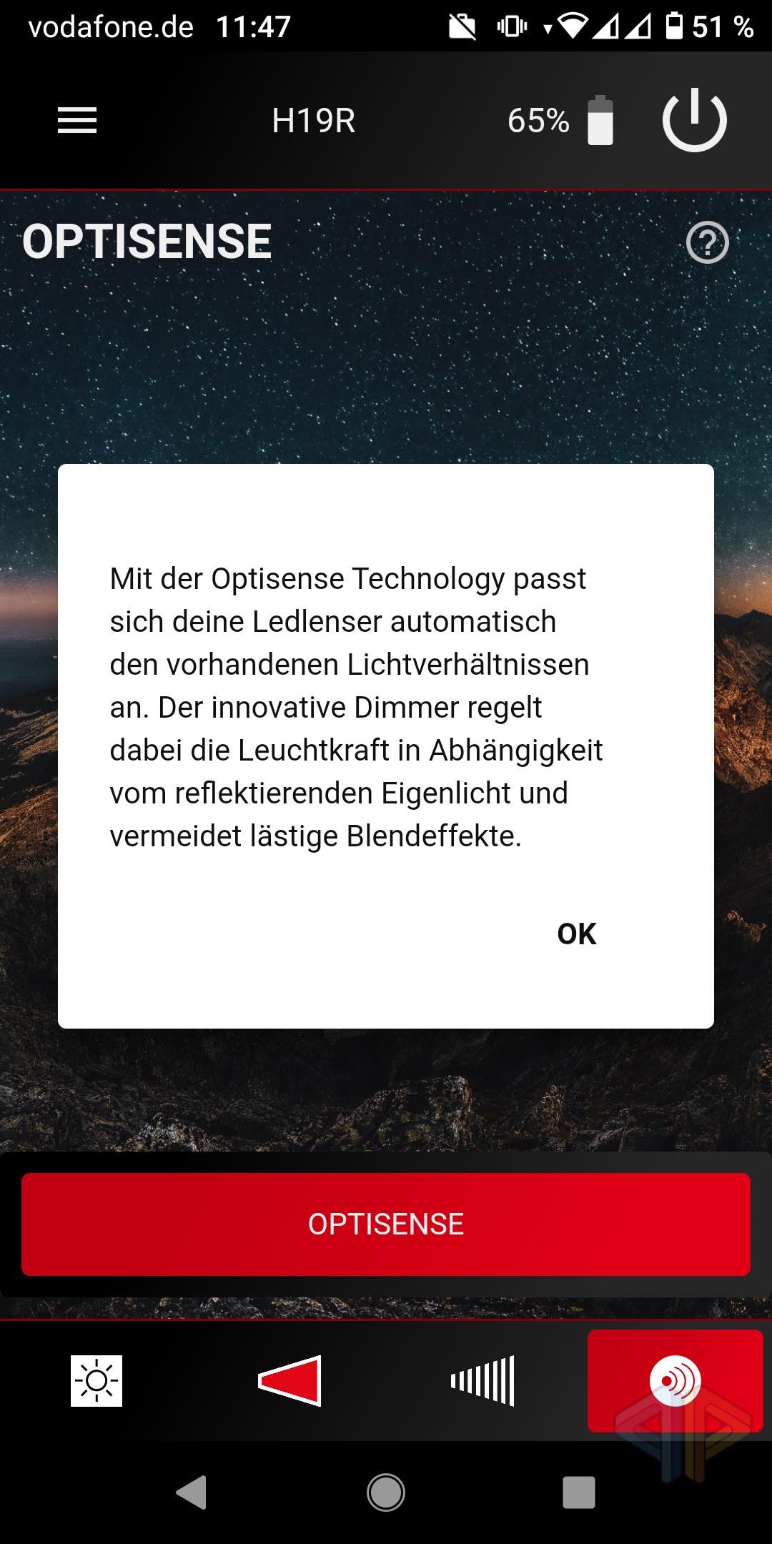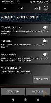 Die Verbindung der Stirnlampe zur App klappt übrigens tadellos und auf Anhieb, auch wenn etwa im Google Play Store die eine oder andere Rückmeldung von Problemen berichtet. Mit mehreren Geräten und auch unter Apple iOS klappt die Verbindung zügig und problemlos. Vorausgesetzt, der App werden die nötigen Berechtigungen erteilt. Die App ist identisch auf iOS und Android und recht umfangreich aber gleichzeitig intuitiv gestaltet. Alle Optionen werden kurz mit einem ausführlichen Popup-Text erklärt und funktionieren wie versprochen.