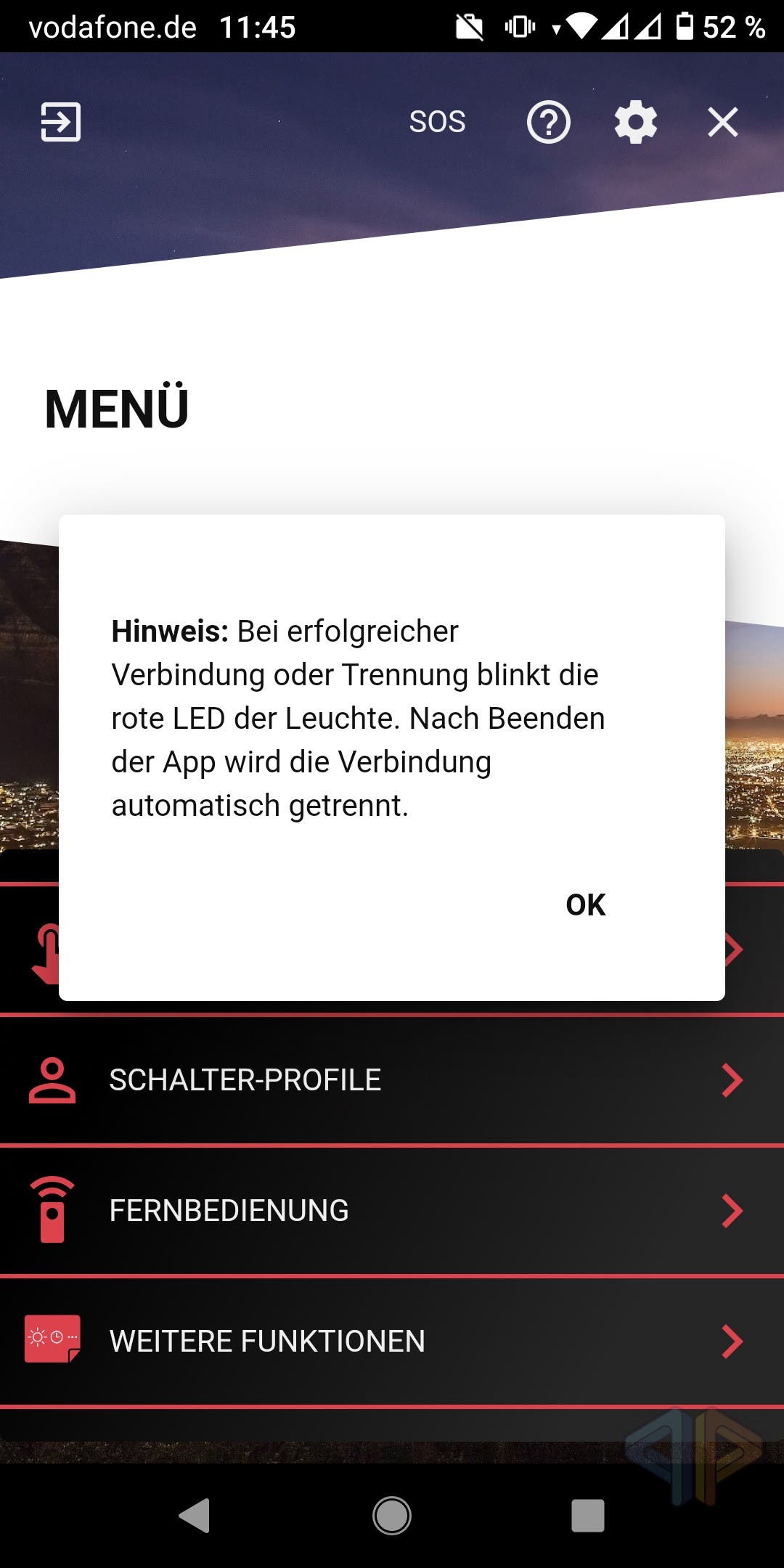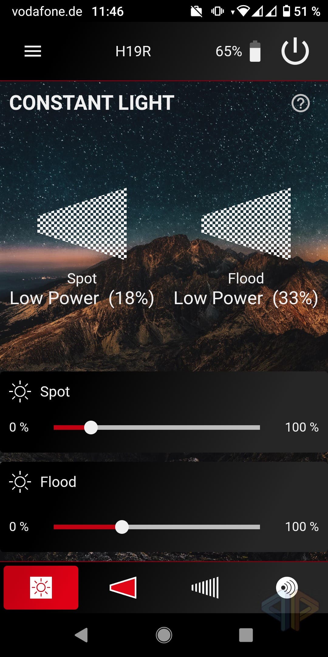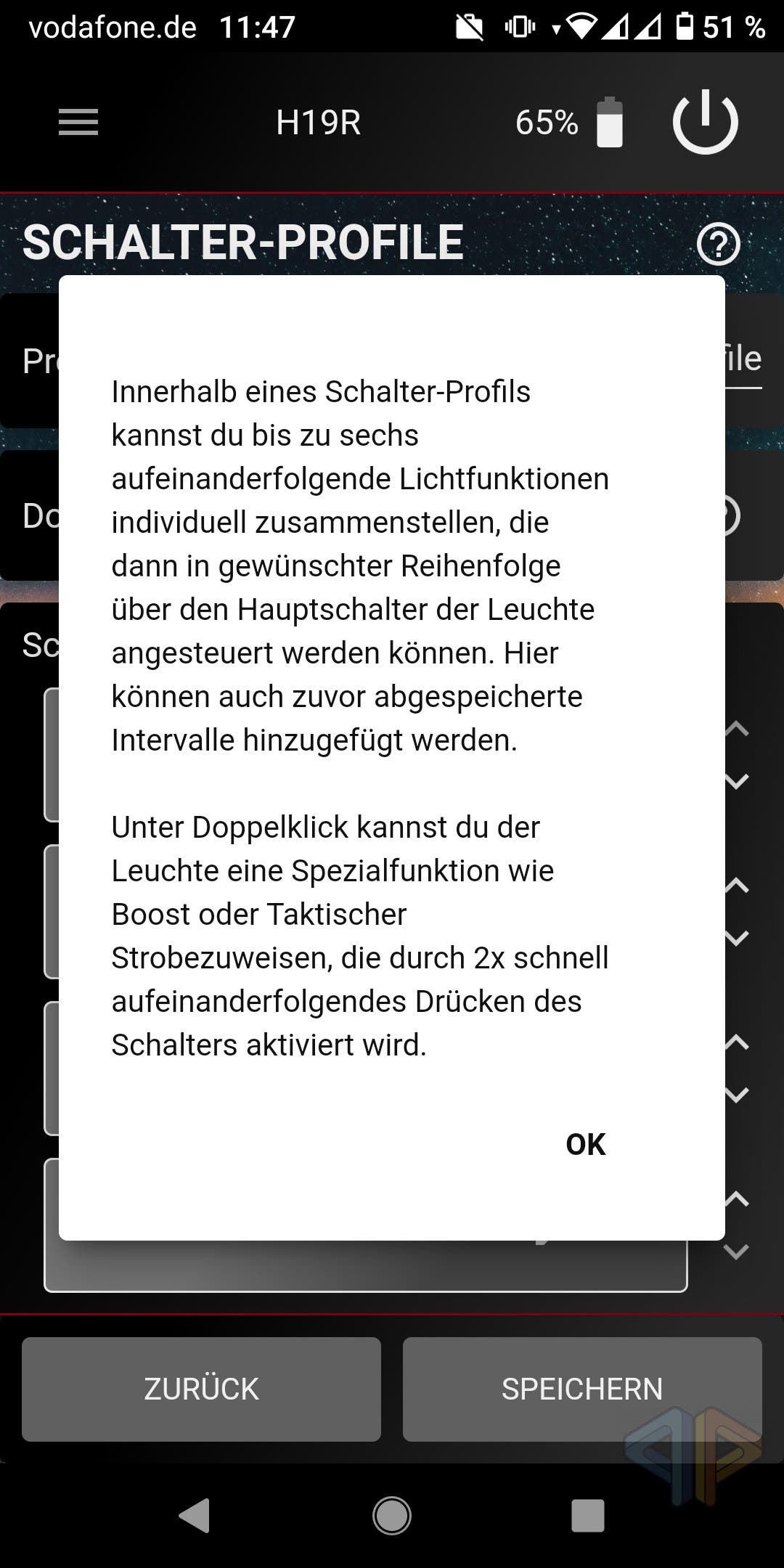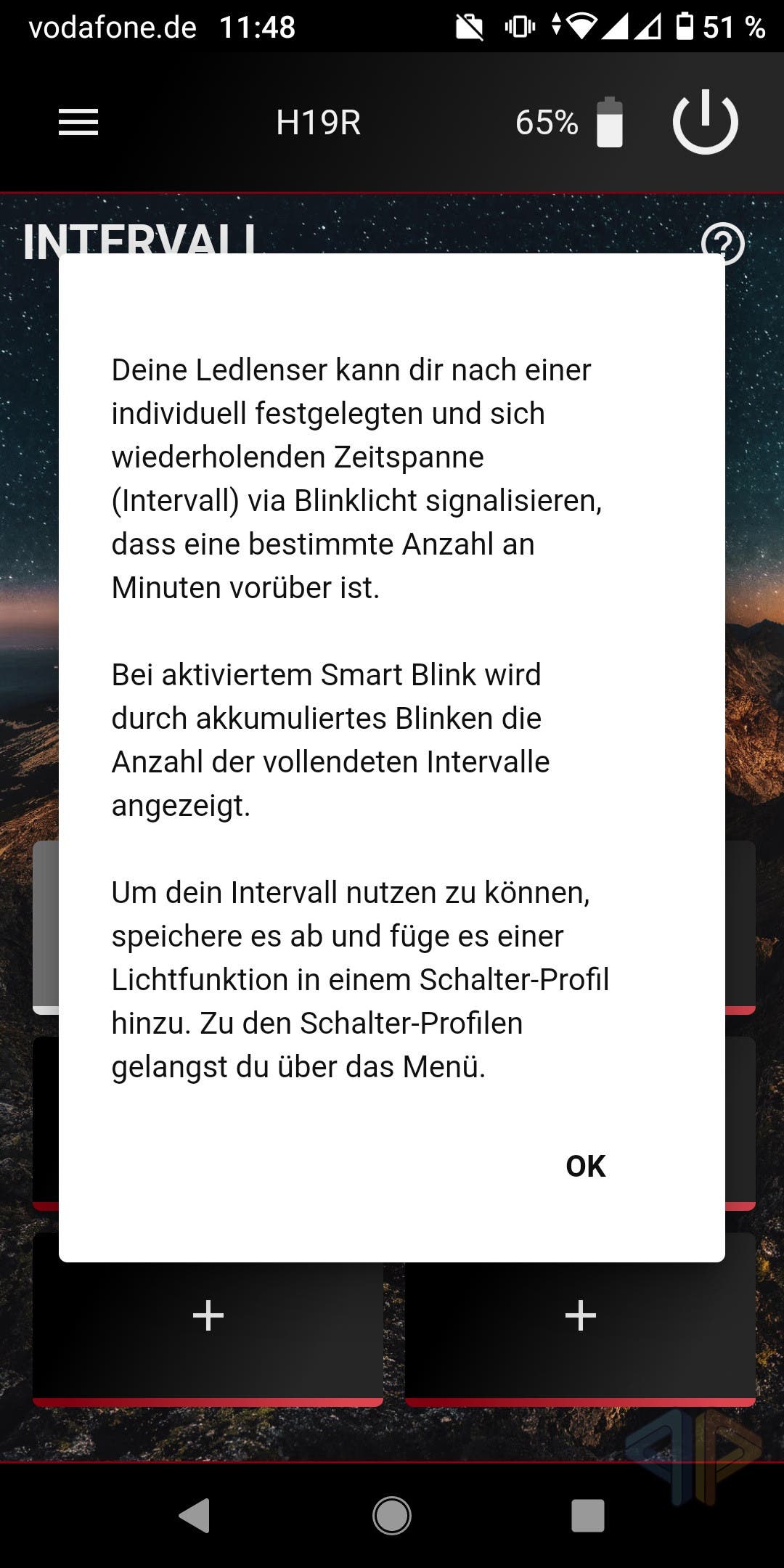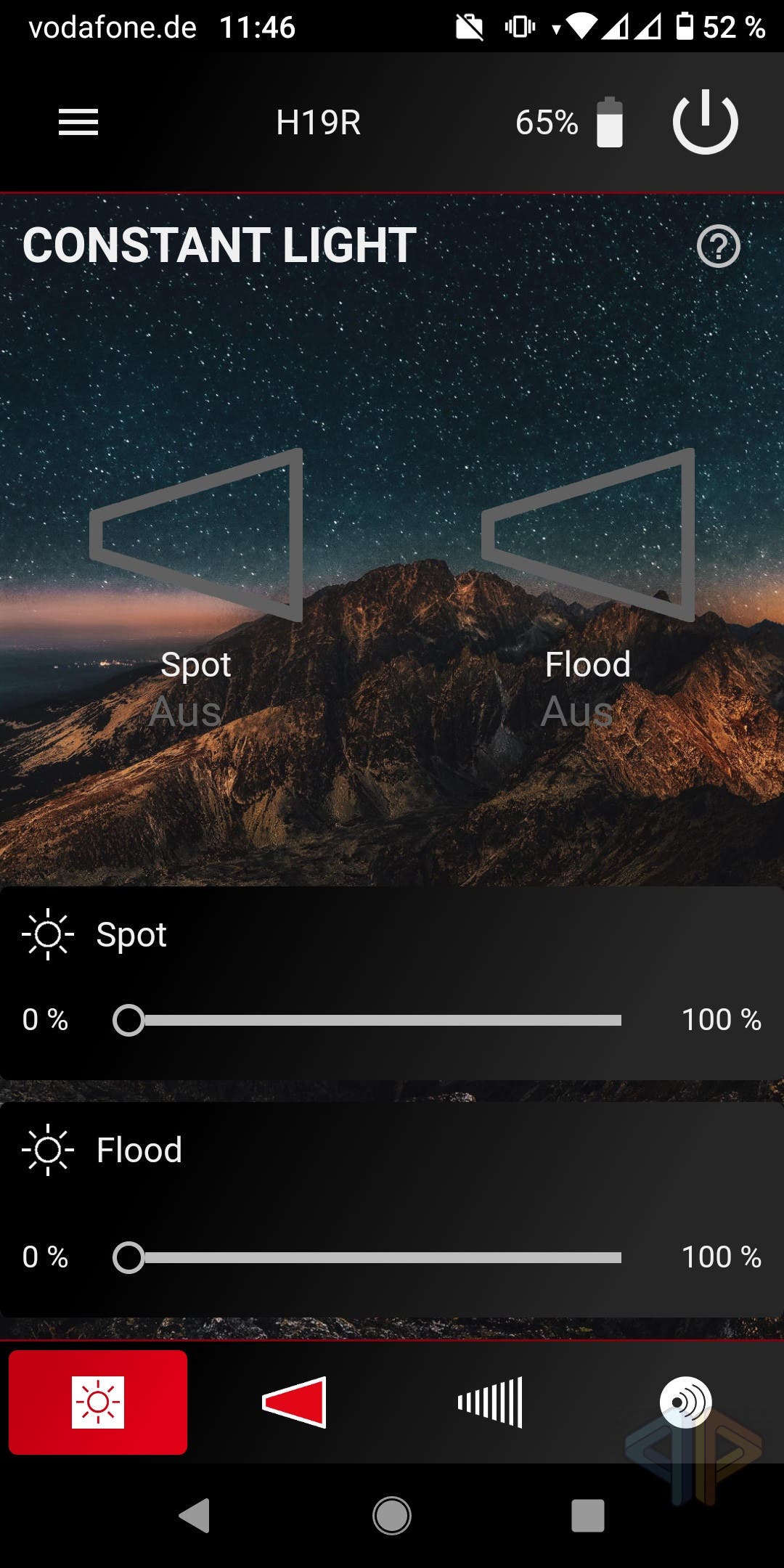 Die Verbindung der Stirnlampe zur App klappt übrigens tadellos und auf Anhieb, auch wenn etwa im Google Play Store die eine oder andere Rückmeldung von Problemen berichtet. Mit mehreren Geräten und auch unter Apple iOS klappt die Verbindung zügig und problemlos. Vorausgesetzt, der App werden die nötigen Berechtigungen erteilt. Die App ist identisch auf iOS und Android und recht umfangreich aber gleichzeitig intuitiv gestaltet. Alle Optionen werden kurz mit einem ausführlichen Popup-Text erklärt und funktionieren wie versprochen.