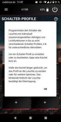 Zudem können bis zu acht unterschiedliche Schalterprofile programmiert werden. Jedes dieser Profile kann bis zu sechs aufeinander folgende Lichtfunktionen enthalten, so dass beispielsweise Lichtsignale oder schnelle Stroboskop-Effekte hinterlegt werden können. Alle diese Funktionen gelten sodann für die Tasten am Lampenkopf und die Fernbedienung gleichermassen, wenn die Lampe schon eingeschaltet ist.