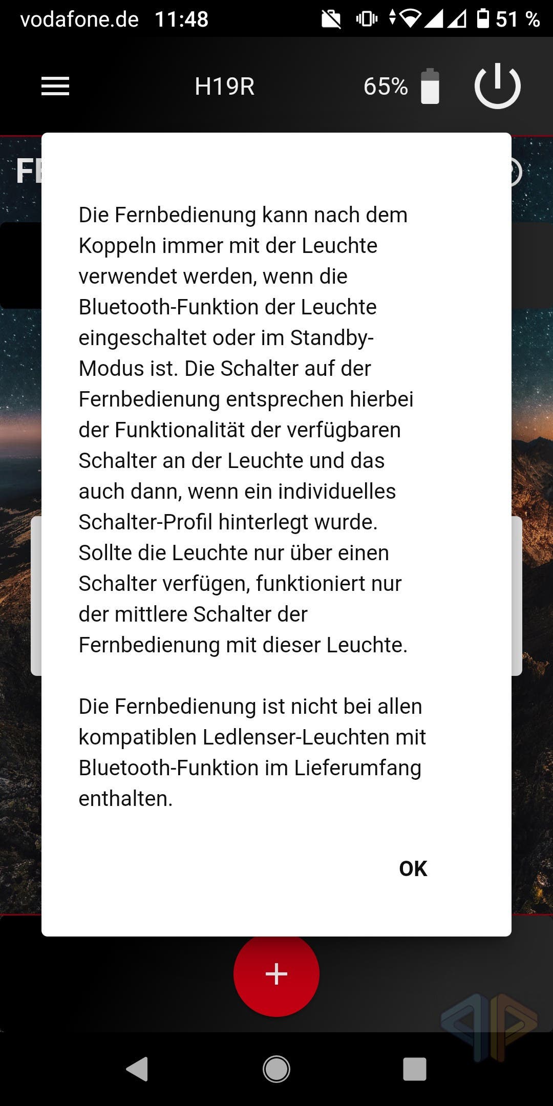 Um die Remote Control der Ledlenser H19R Signature verwenden zu können, muss diese einmalig per App eingerichtet werden. Danach muss die Stirnlampe eingeschaltet sein (nicht unbedingt leuchten), um die BT-Remote einsetzen zu können.