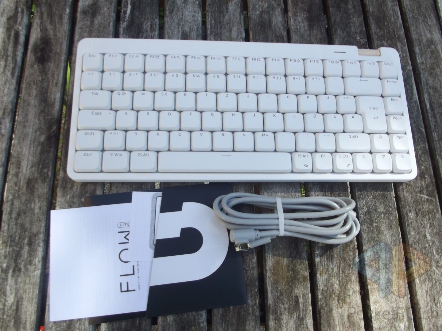 Die Lofree Flow Lite ist in zwei Varianten erhältlich. Als Flow Lite84 und als Flow Lite100, womit auch gleich die Anzahl der Tasten im Namen angezeigt wird. Die Lofree Flow Lite 84, die uns im Test hier vorliegt, ist indes mit einem Tastaturlayout für Deutschland erhältlich und entspricht so einem 75 Prozent-Layout. Es fehlt der Ziffernblock und die Sondertasten sind doppelt belegt auf den Funktionstasten. Die Lofree Flow Lite100 gibt es indes noch nicht mit QWERTZ-Tastenkappen ab Werk.