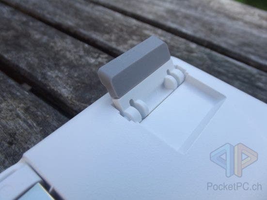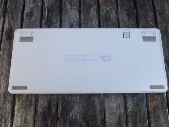 Auf der Unterseite ist nicht nur der Aufbewahrungsort für den USB-Stick zu finden, sondern auch vier Gummipads zur sicheren Verwendung auf glatten Oberflächen angebracht. Die Lofree Flow Lite kann zudem mit den hinteren beiden Füssen angestellt und so in einem Winkel von drei Grad oder sechs Grad benutzt werden.