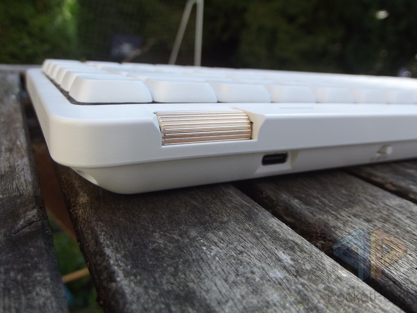 Die Tastatur selbst besitzt, wie bereits erwähnt, 84 Tasten, wobei 16 Funktionstasten vorhanden sind. Alle Tasten sind mit weissen LED hintergrundbeleuchtet. Über der zweiten Tastenspalte von rechts aus gesehen ist ein goldenes Rollrad verbaut, dass für die Lautstärkeregelung genutzt werden kann. Daneben ist eine Status-LED zu sehen. Wie für 75-Prozent-Tastaturen üblich, sind die Sondertasten auf der rechten Seite fast alle senkrecht angebracht.