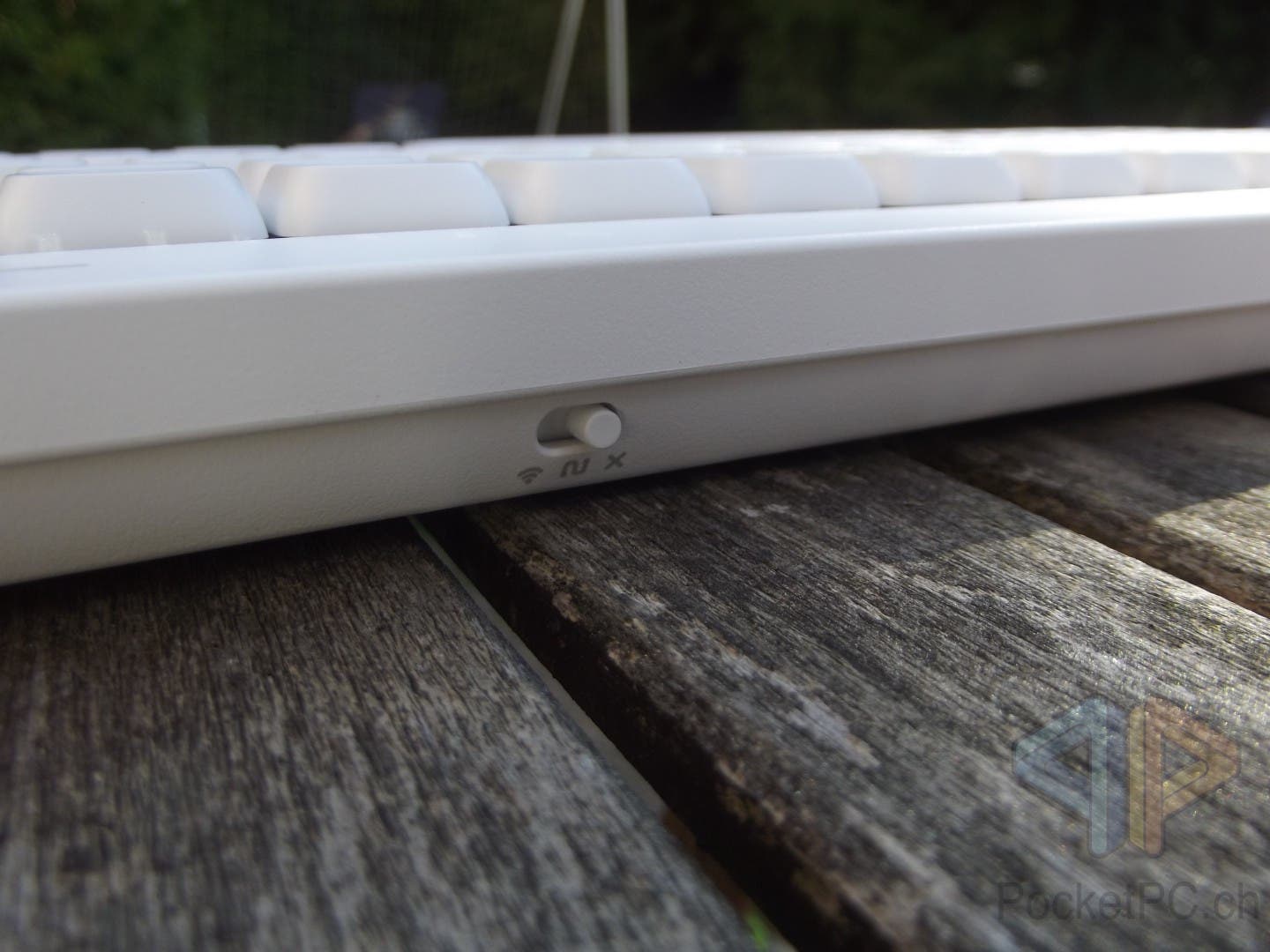 An der Oberseite ist rechter Hand der USB-C-Anshluss zu finden und etwas daneben ein kleiner Schiebeschalter, mit dem zwischen Bluetooth, 2.4-GHz und USB-Verbindung umgeschalten werden kann.