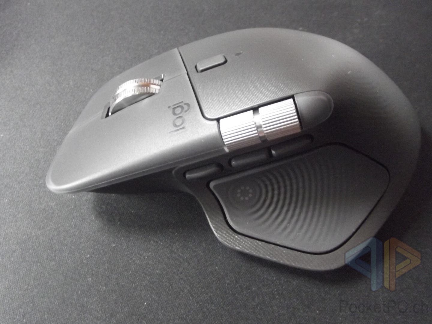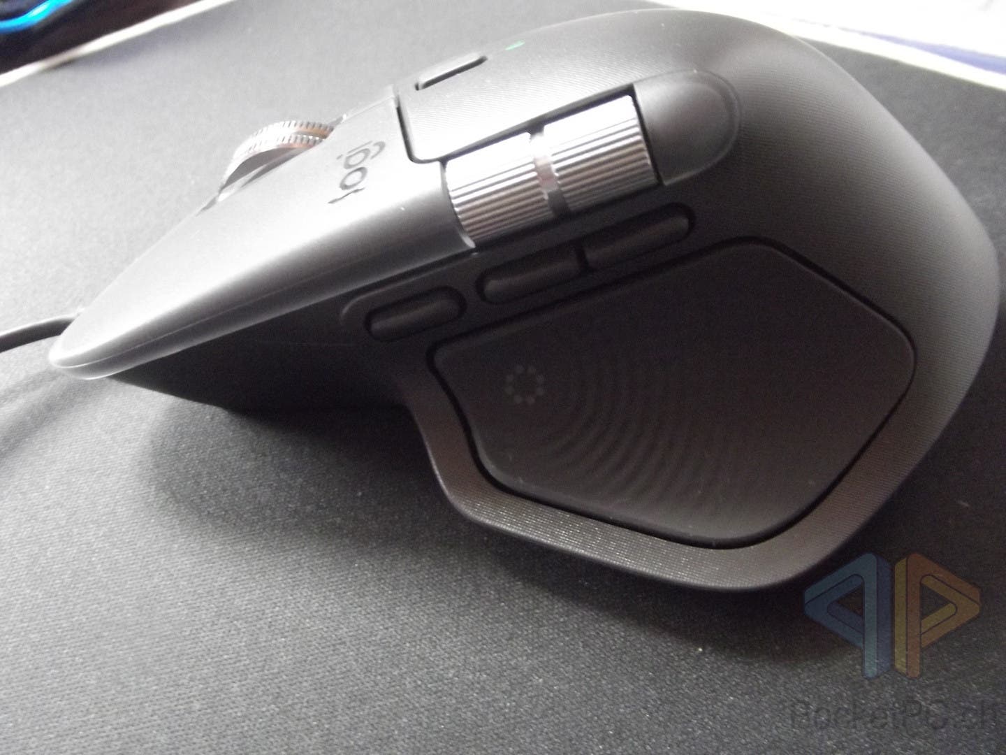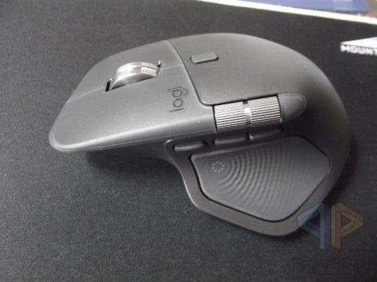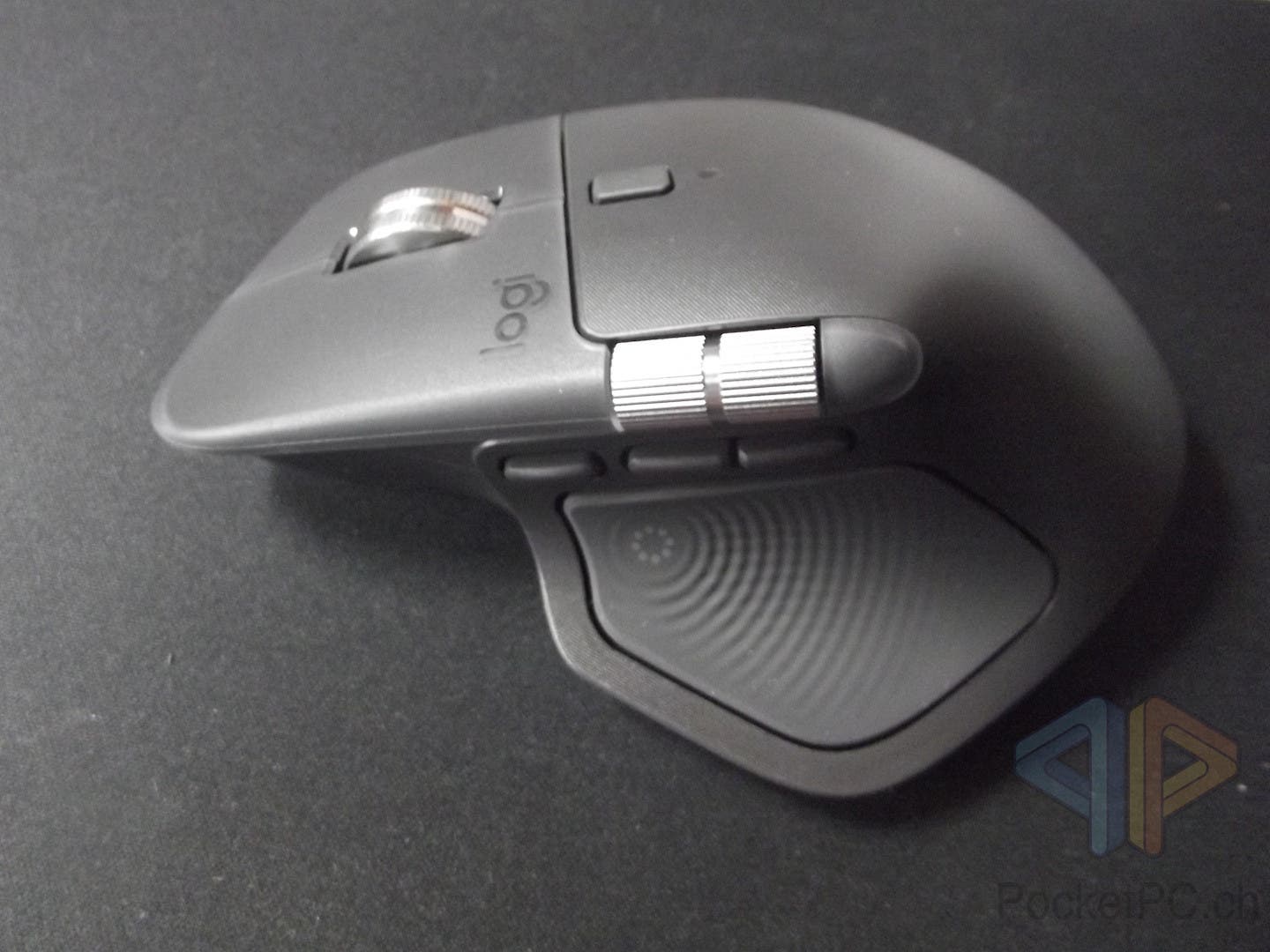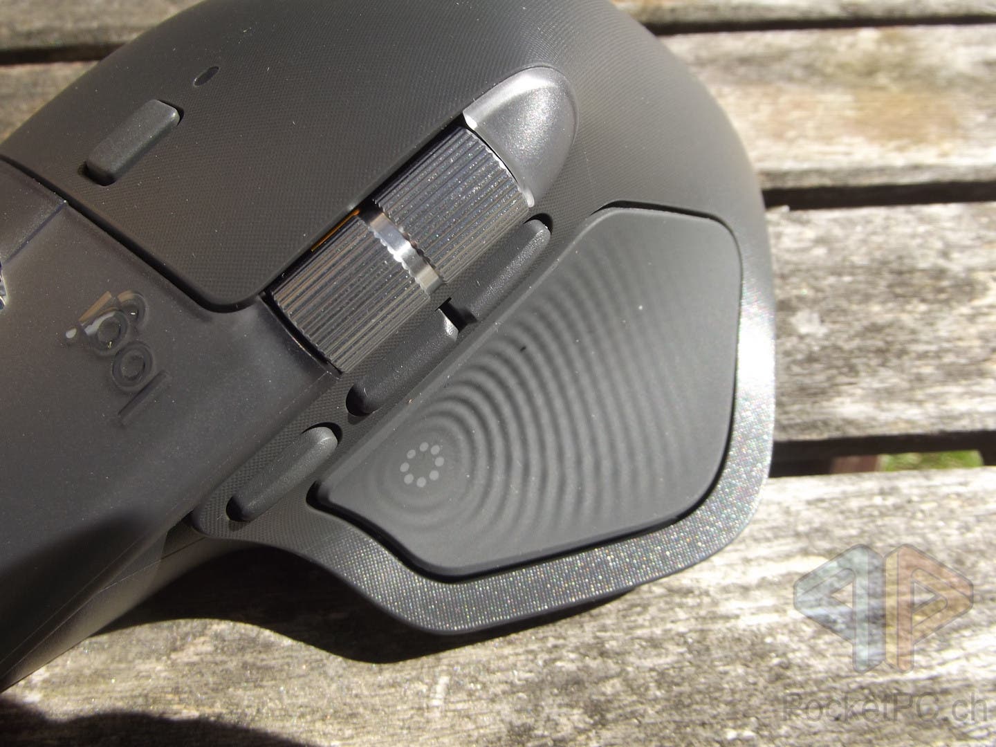 Schliesslich wurde die Gesten-Taste vom Daumengriff, wo sie sich beim MX Master 3S noch vor drei Jahren befand auf eine spezielle Taste neben den beiden anderen Daumentasten direkt unter dem horizontalen Scrollrad verlegt. Wenn man diese, vorderste der drei Tasten dort, gedrückt hält, kann man die Maus in eine bestimmte Richtung bewegen, um die gewünschte Aktion auszuführen, statt nur den Cursor zu verschieben.