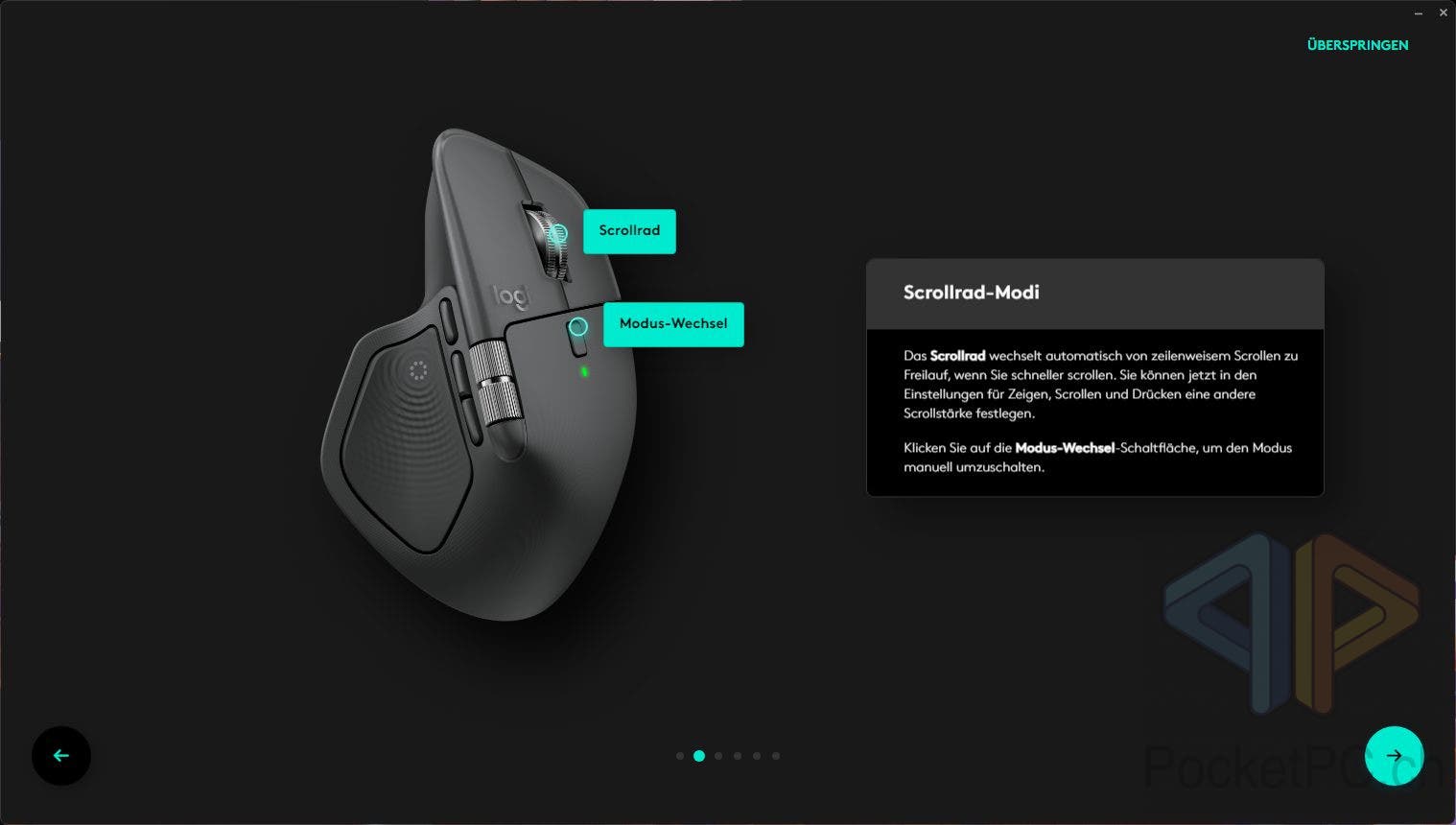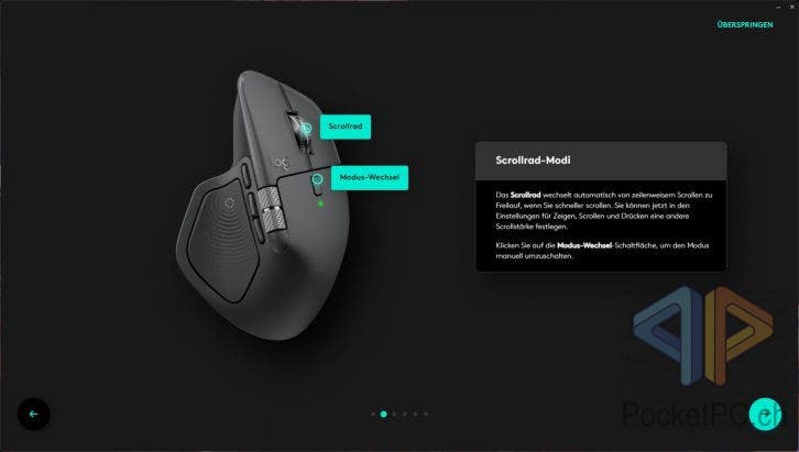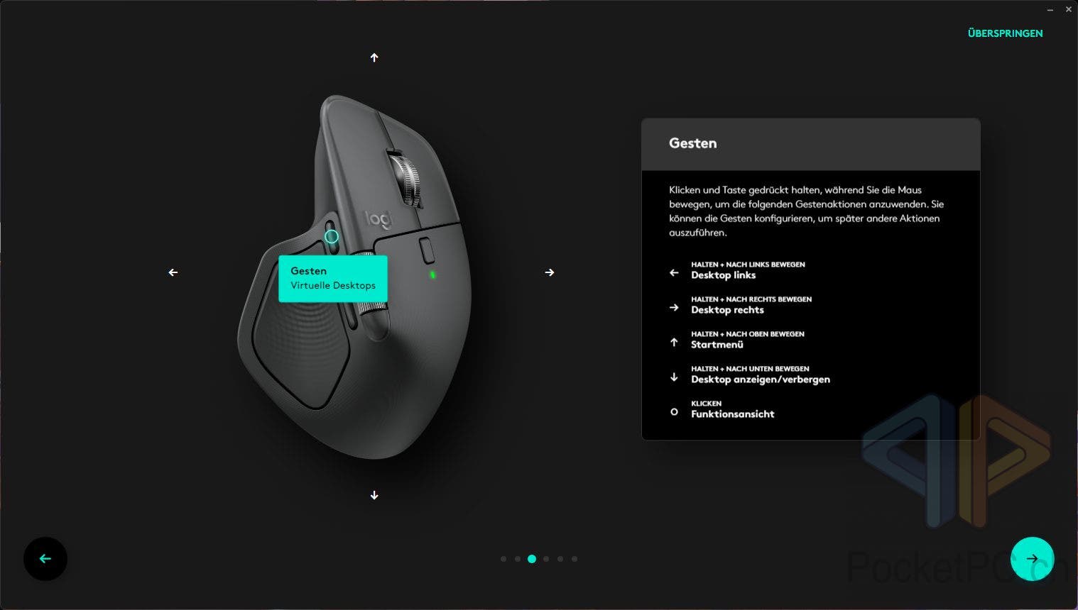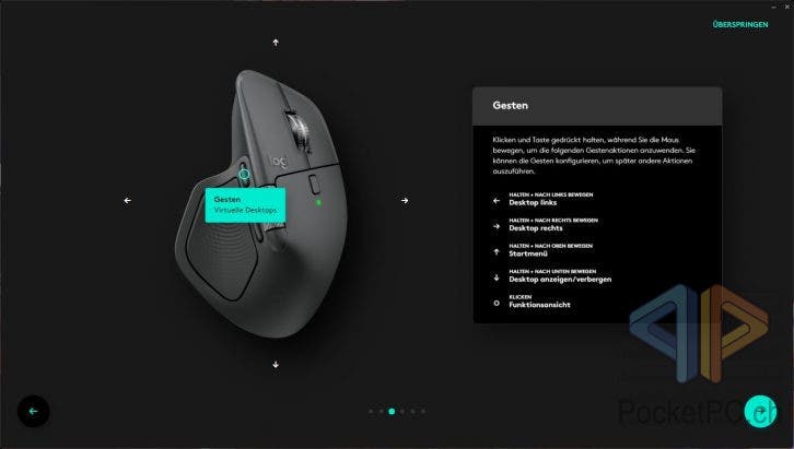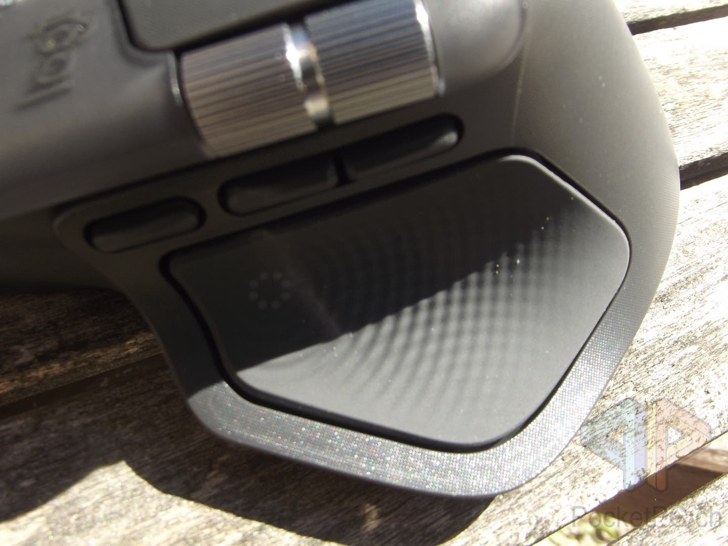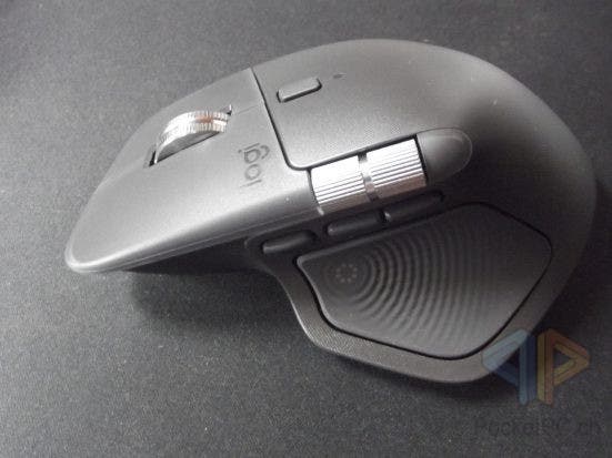 Schliesslich wurde die Gesten-Taste vom Daumengriff, wo sie sich beim MX Master 3S noch vor drei Jahren befand auf eine spezielle Taste neben den beiden anderen Daumentasten direkt unter dem horizontalen Scrollrad verlegt. Wenn man diese, vorderste der drei Tasten dort, gedrückt hält, kann man die Maus in eine bestimmte Richtung bewegen, um die gewünschte Aktion auszuführen, statt nur den Cursor zu verschieben.