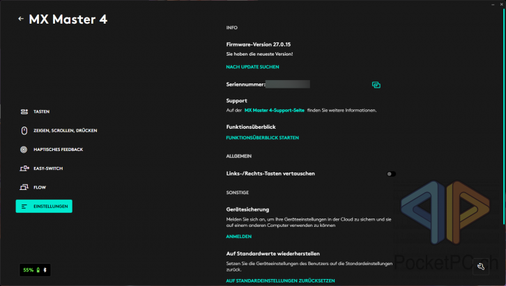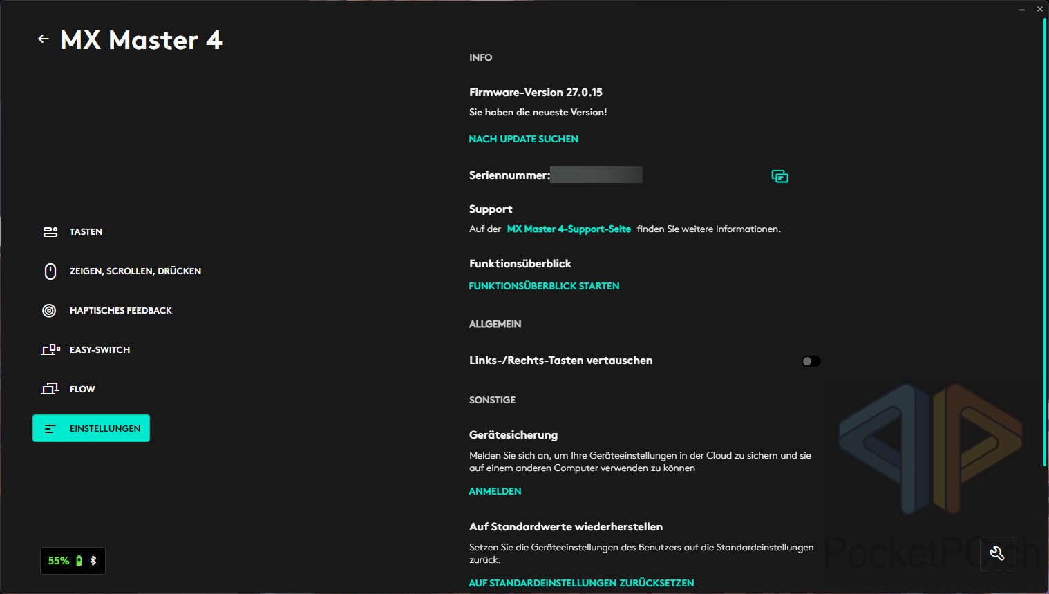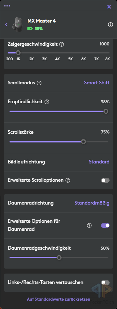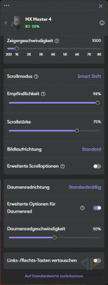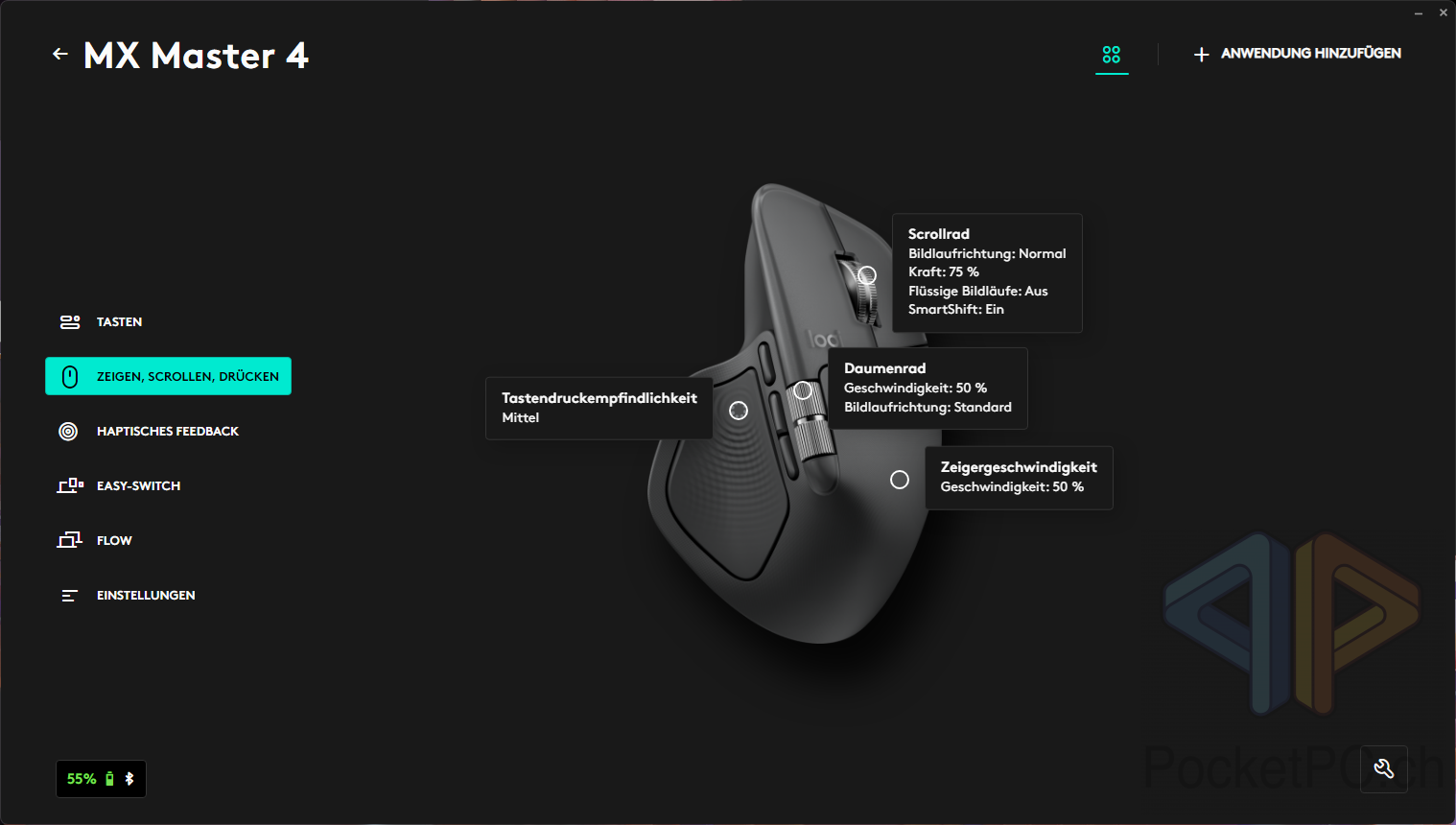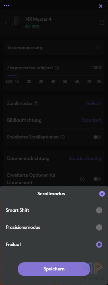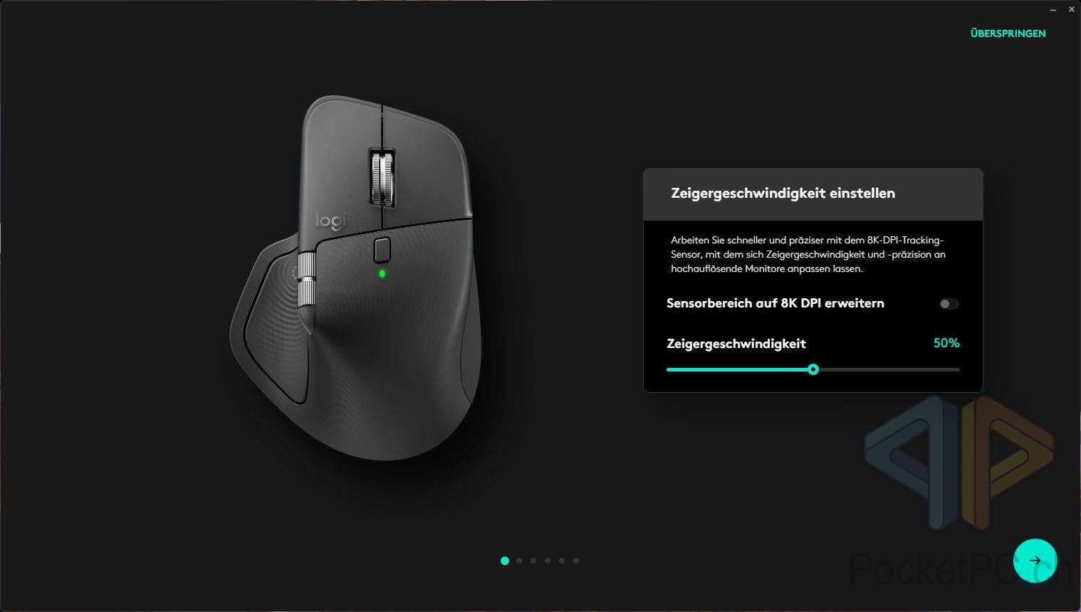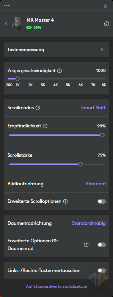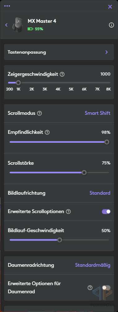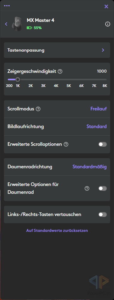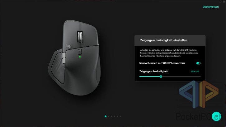 Der Sensor des MX Master 4 ist ein hochpräzises Darkfield Sensor mit 1000 DPI Nennwert, die von 200 bis 8’000 DPI in 50-DPI-Stufen einstellbar sind. Das sind die 8k Abtastrate, mit der geworben wird.