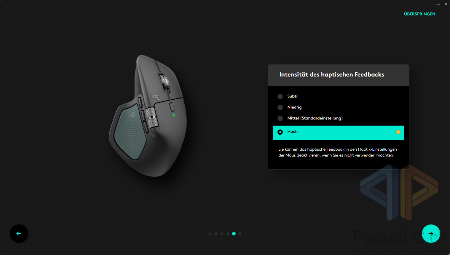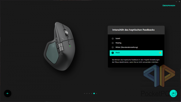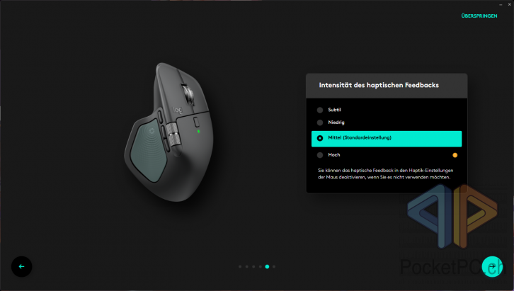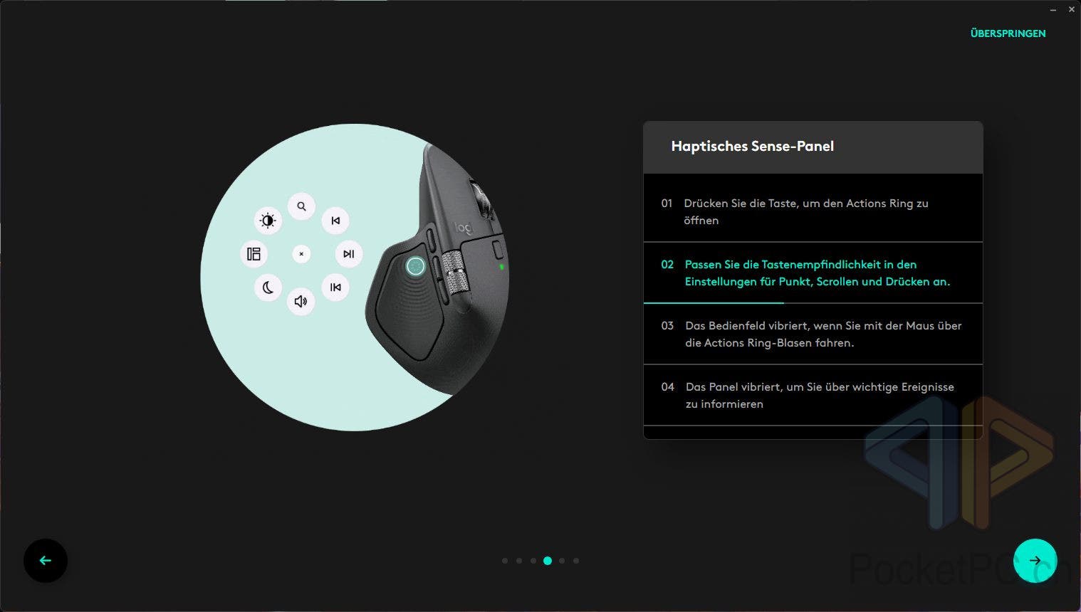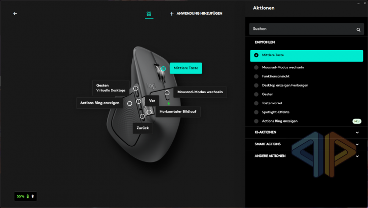Klar, Action Rings sind nichts Neues. Das gibt es schon länger von Logitech und auch bei anderen Herstellern. Die haptischen Empfindungen, die sich aus ihrer Navigation ergeben, sind hingegen neu. Durch Klicken auf die Haptik-Taste wird ein Ruck ausgelöst, ebenso wie durch Bewegen des Cursors zwischen den Blasen des Action Rings. Das ist eine kleine, aber feine Funktion, die ich zunächst für eine Spielerei hielt, aber unterdessen sehr schätze. Es ergibt wirklich Sinn, dass die Maus kurz reagiert, wenn man eine der kreisrunden Schaltflächen im Action Ring auswählt. Das verbessert das Erlebnis bei der Arbeit durchaus.