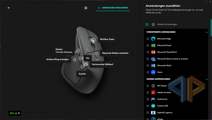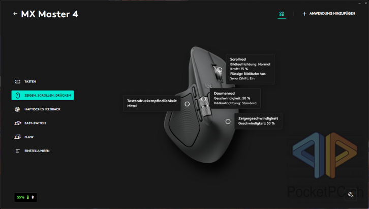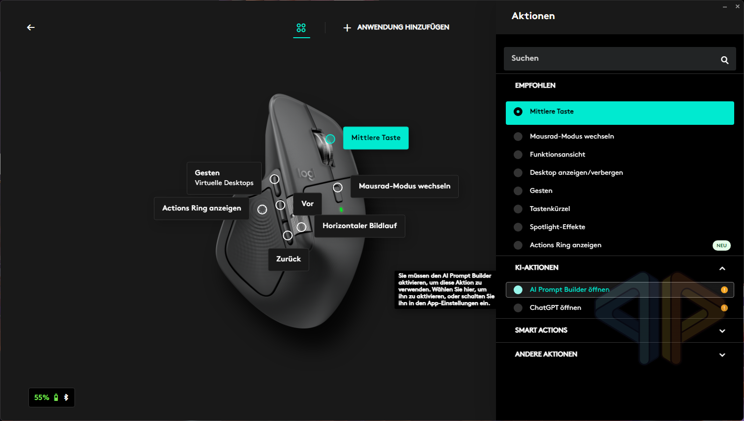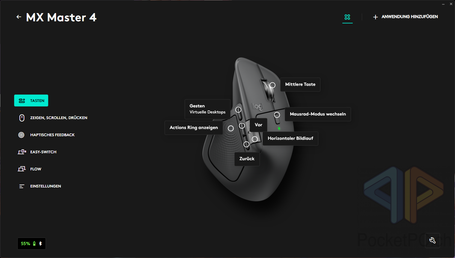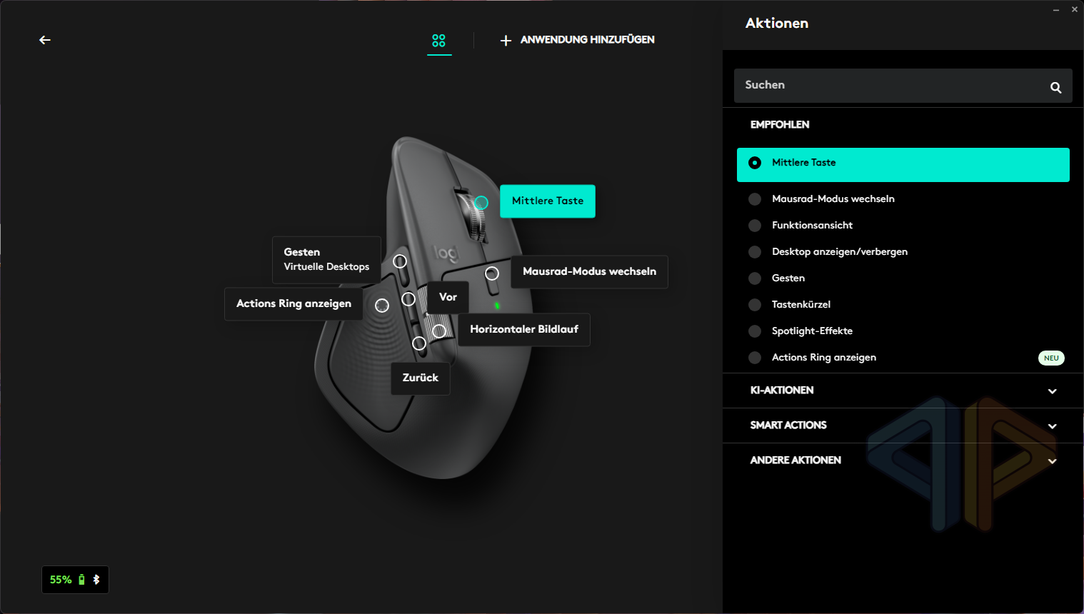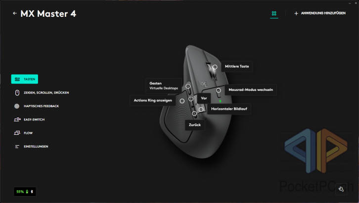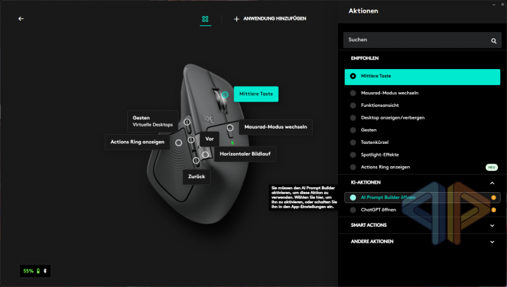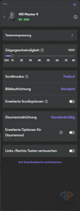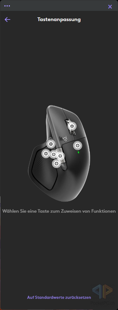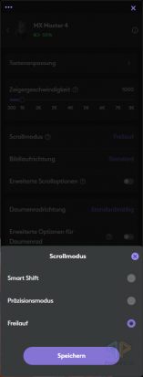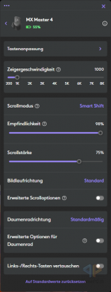 In Logitech Options+ können alle Einstellungen der MX Master 4 Maus vorgenommen werden, während die Software LogiTune nur einige der grundlegenden Features einstellen lässt. Namentlich die ActionWheels fehlen hier, aber die Tasten und die Räder lassen sich alle auch programmieren.