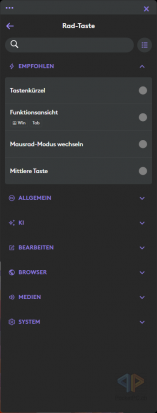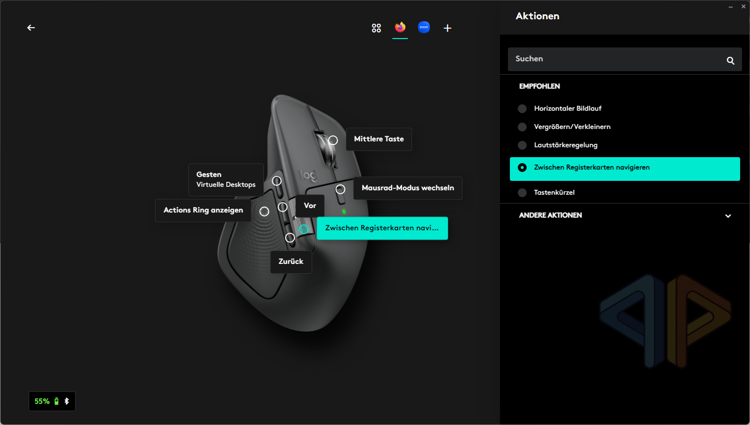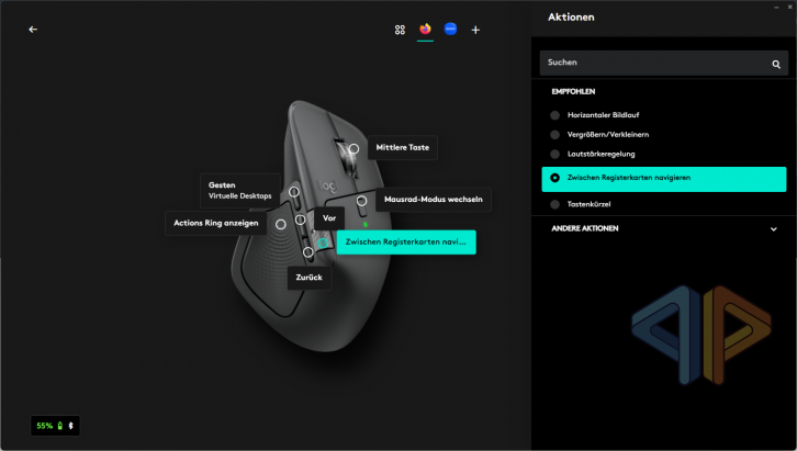 Übrigens ist auch das Daumenrad eine tolle Sache. Nicht so sehr für den horizontalen Bildlauf. Den braucht man ja wirklich nicht sehr häufig. Aber ich hab ihn beispielsweise so eingestellt, dass ich im Browser damit die Tabs umschalten kann. Das ist wirklich praktisch für mich.