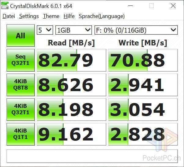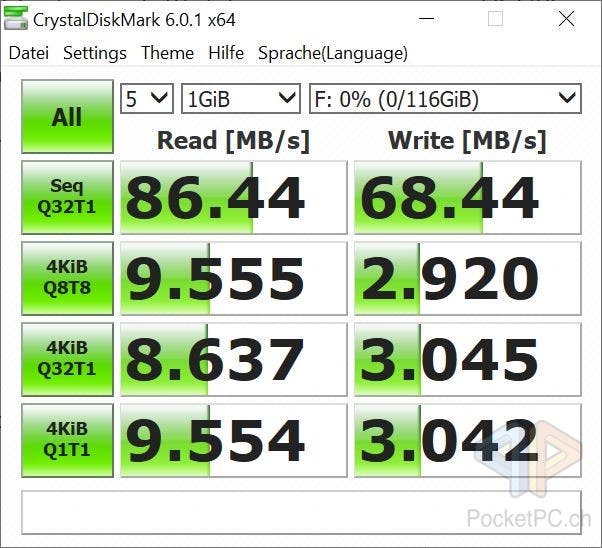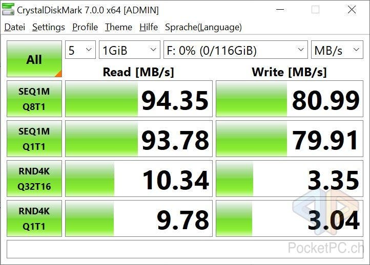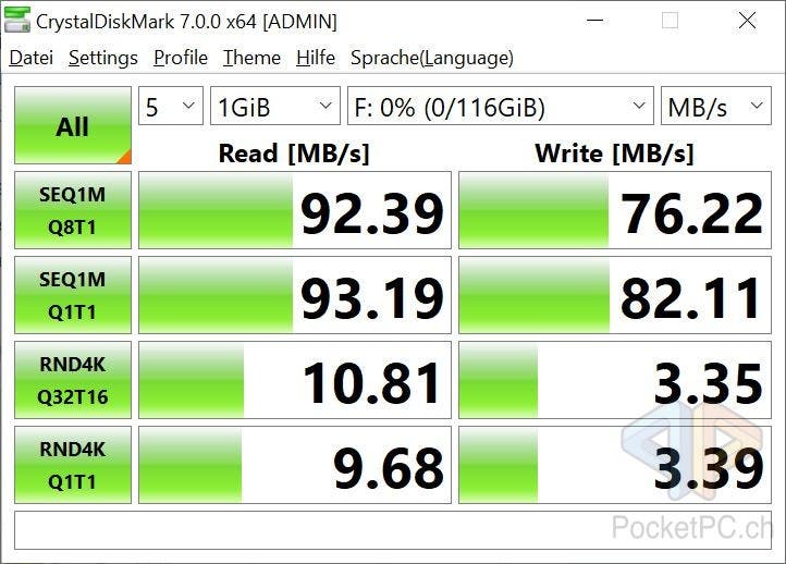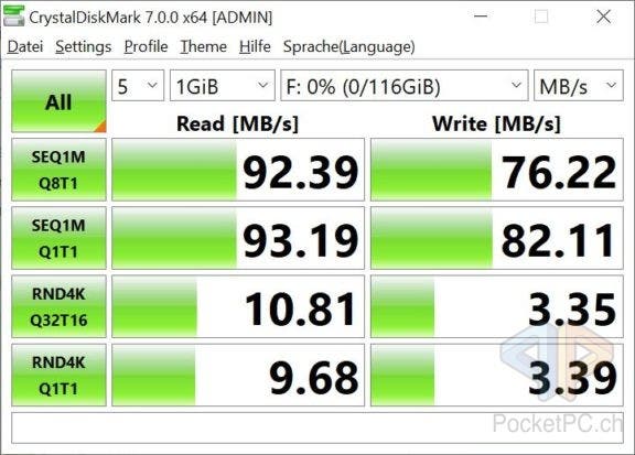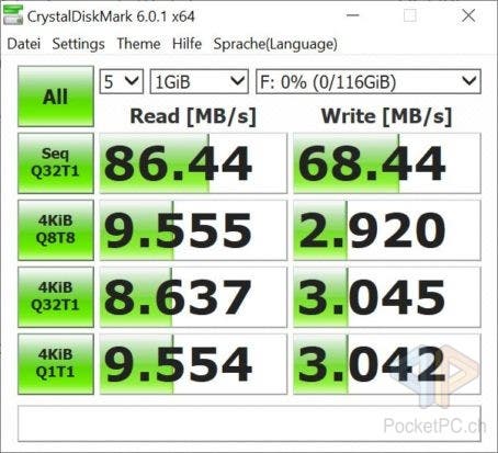 Direkt im Windows 10-Laptop eingeschoben wurde die Speicherkarte mit CrystalDiskMark 6.0.1 x64 und 7.0.0 x64 jeweils zehn mal pro Dateisystem (NFTS und exFAT) in den Standardeinstellungen getestet. Im folgenden seht ihr die Werte, die am nächsten am Durchschnitt waren.