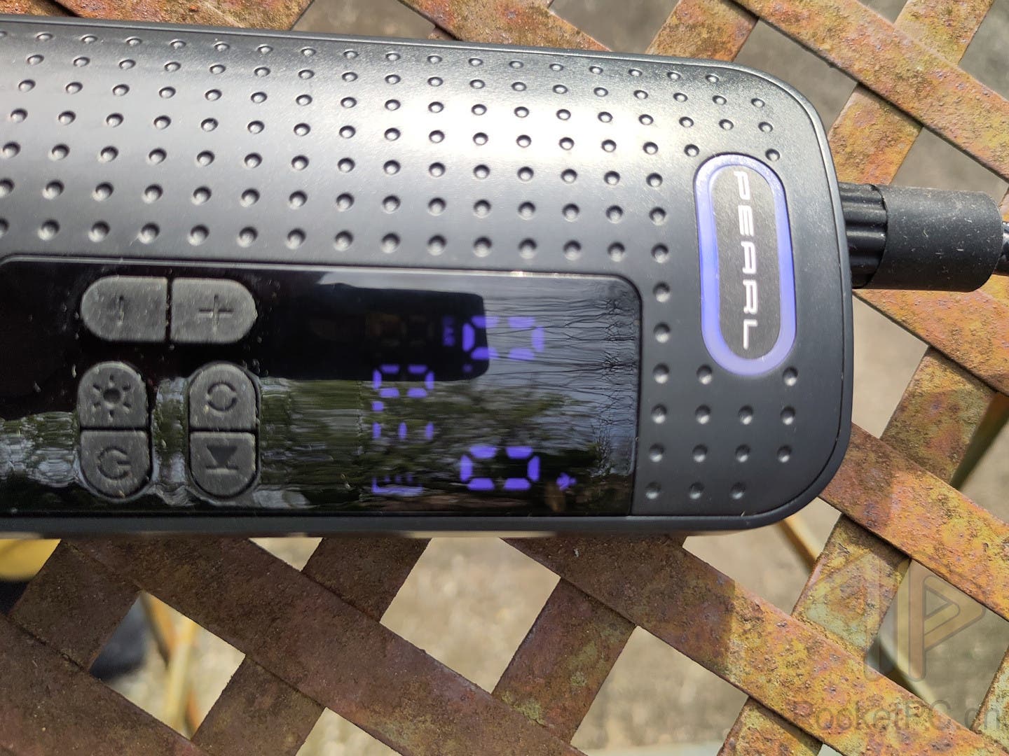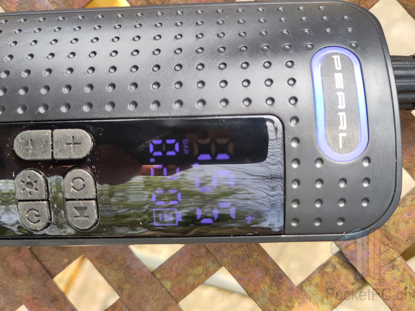 Darüber ist ein weisses, hintergrundbeleuchtetes LED-Display zu sehen, dass Luftdruck und Zielluftdruck anzeigt sowie über den Akkustand informiert. Hier werden auch fünf Symbole für die fünf Modi angezeigt: Fahrrad, Motorroller, Auto, Ball und Manuell. Diese Modi dienen dazu, die passenden Druckbereiche vorauszuwählen.