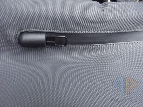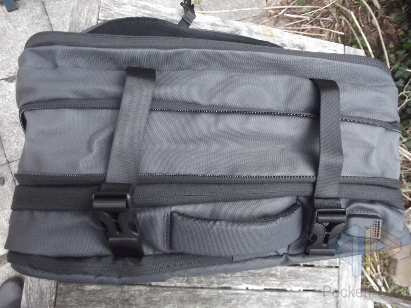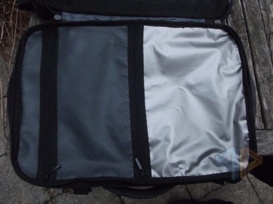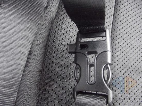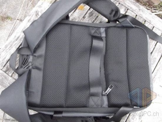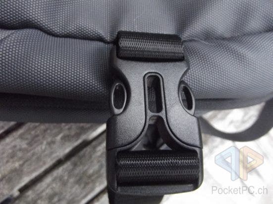 Die Rückseite verbirgt nicht nur die Rückenpolster und eine Schlaufe zum Befestigen des Kabinengepäcks an der Kofferstange. Hier ist auch ein verstecktes Reissverschlussfach für Wertgegenstände eingenäht. Die verstellbaren Schultergurte sind nicht nur gepolstert. Sie bieten auch eine Schnalle zum Arretieren des Brustgurts, so dass die Last besser verteilt werden kann. in der linken Schnalle des Brustgurts ist zudem eine Signalpfeife eingebaut und im linken Träger ist eine kleine Tasche mit Reißverschluss zu finden; ideal für Schlüssel oder Kleingeld.