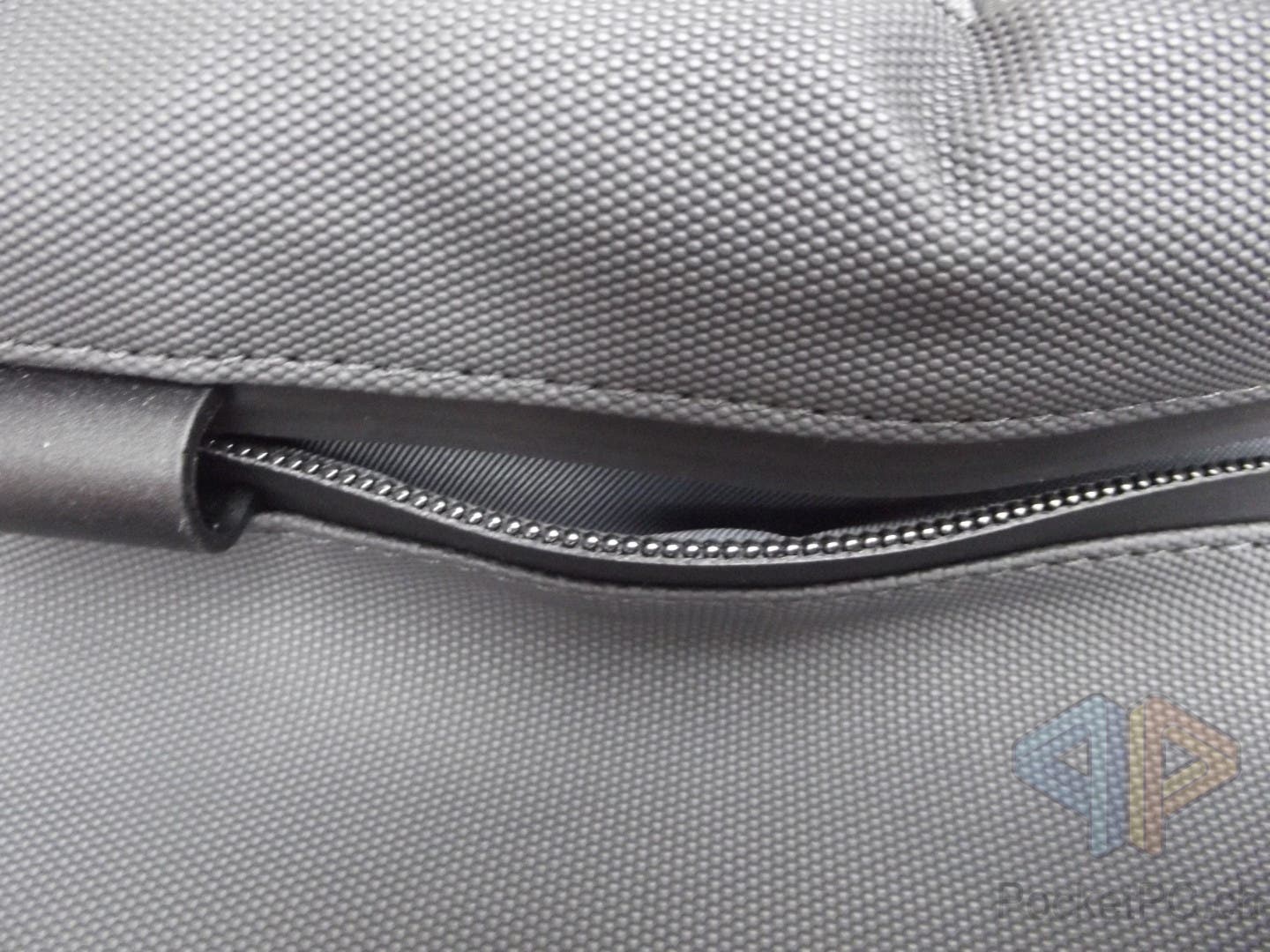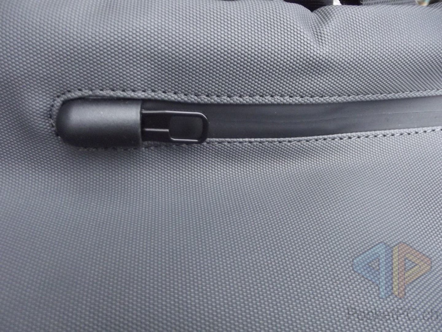 Auf der Vorderseite befinden sich zwei Reissverschlussfächer. Das vertikale kommt mit einem flachen, schwarzen Zip daher und der Reiter dazu wird von einer Kunststoffkappe geschützt. Er erlaubt den einfachen Zugriff auf ein kleines Fach auf der Vorderseite. Darüber ist horizontal unter einer breiten Naht ein weiteres Aussenfach angebracht.