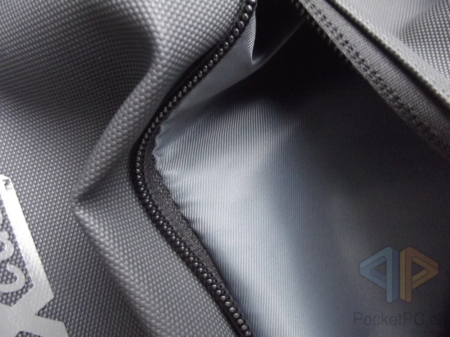 Aus anthrazitfarbenem Polyester gefertigt ist er wasserfest und bietet eine Menge Taschen und Fächer.