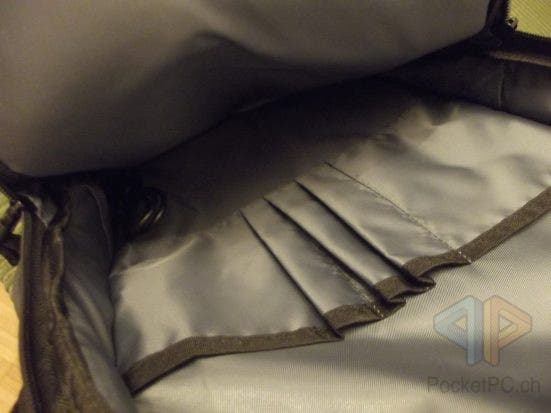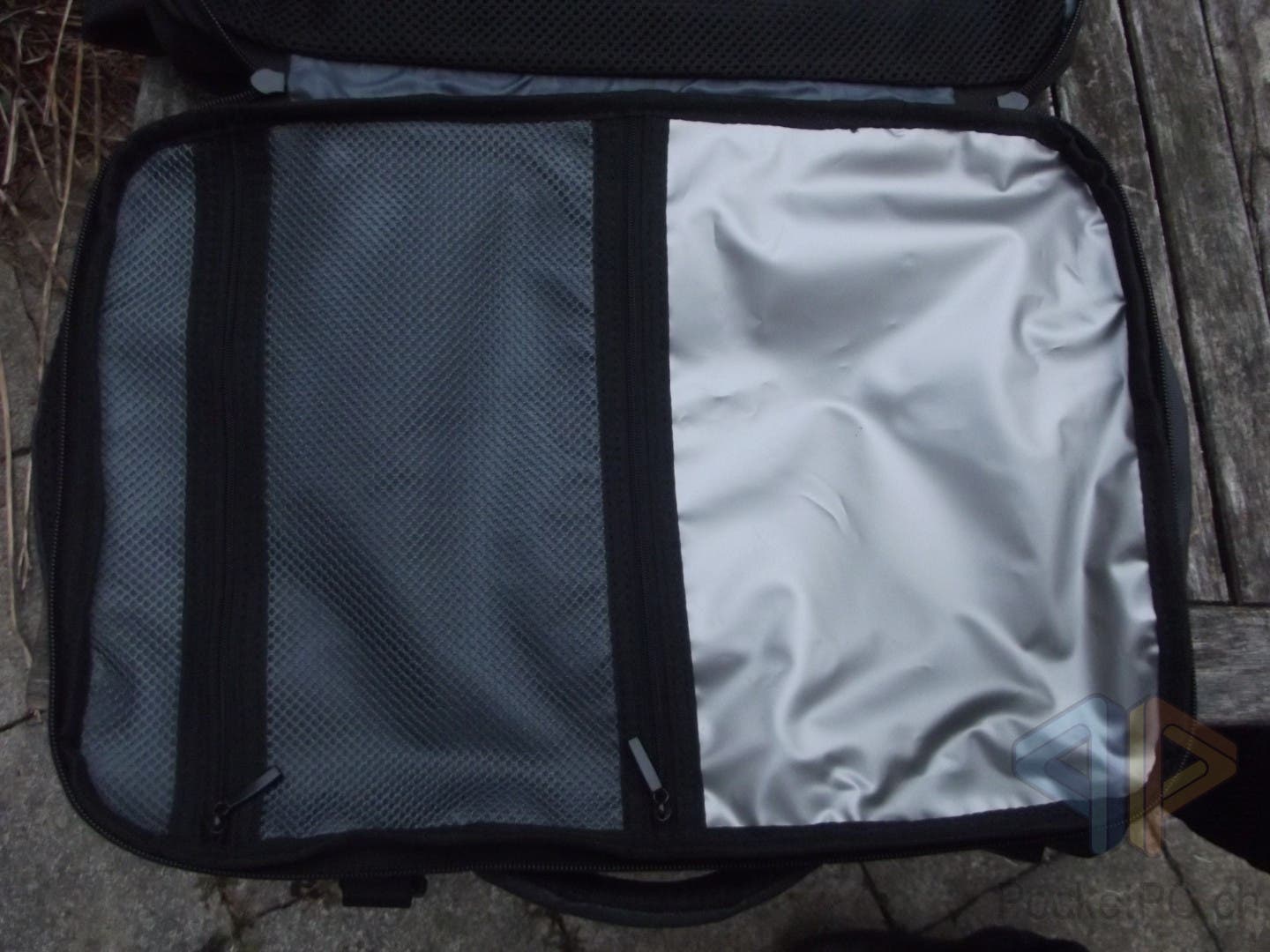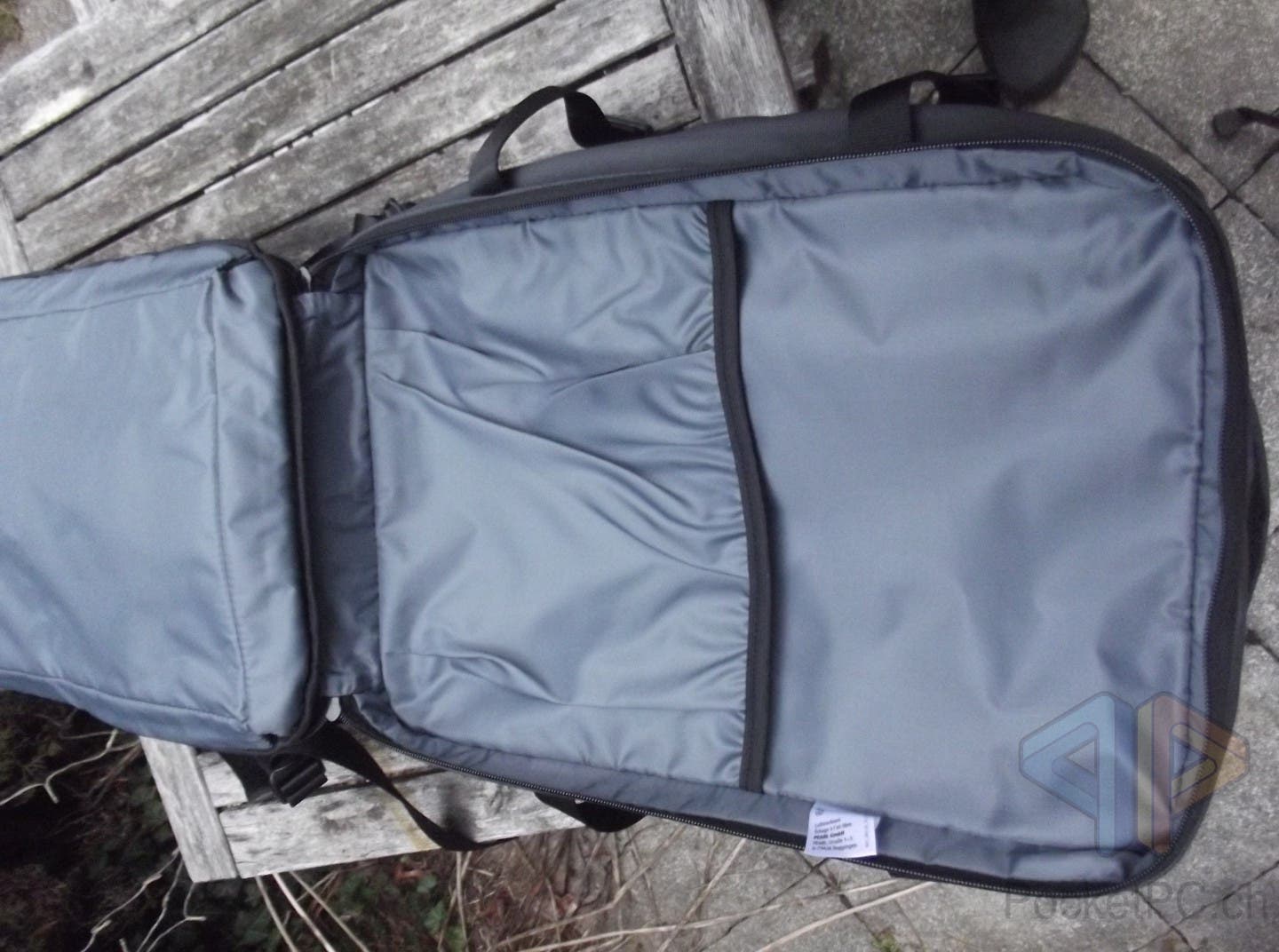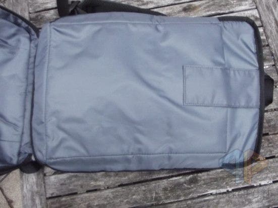 Im Inneren befindet sich ein gepolstertes Laptopfach für Geräte bis zu 15.6 Zoll Displaydiagonale, was 39.6 cm entspricht. Zwei Einsteckfächer nehmen das Zubehör oder weitere Elektronik auf. Das Laptopfach wird nach unten aufgeklappt. An der rechten Seite des Rucksacks ist aussen eine USB-A-Dose eingebaut, deren USB-Kabel im Inneren mit gut 20 cm Länge die bequeme Stromversorgung über einer Powerbank erlaubt, die einfach im Rucksack mitgeführt wird.