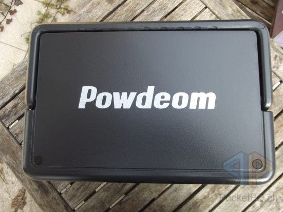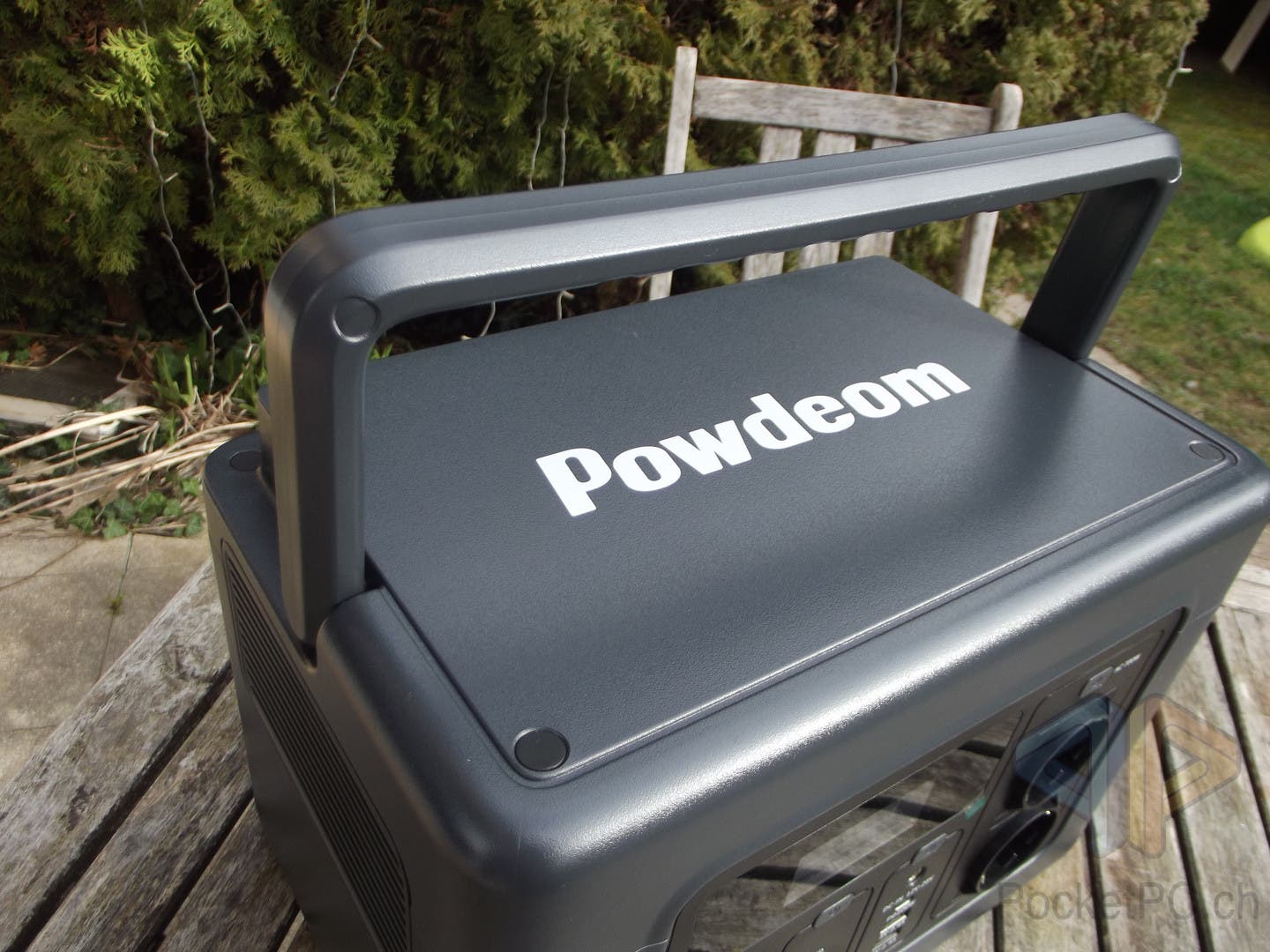 Die riesige Powerbank ist 305 x 200 x 210 mm gross und wiegt 8.5 kg und ist aus dunkelgrauem Kunststoff gestaltet. Auf der Oberseite prangt mittig und weiss der Herstellername POWDEOM und ein 10 cm tiefer Tragebügel über die ganze Breite ist hier ebenso zu finden, der bei Bedarf ausgeklappt werden kann.