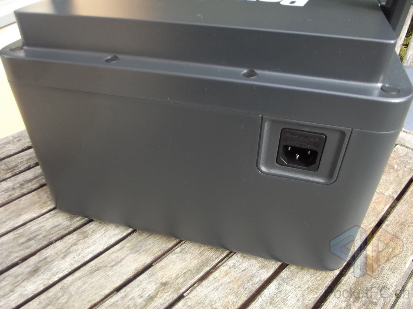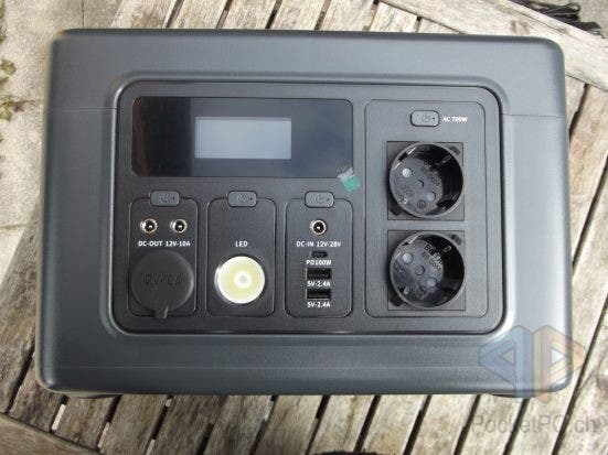 Was auch nicht einleuchten mag ist, dass der 12/24 V Gleichstrom-Eingang für den DC5521 Hohlraumstecker auf der Vorderseite bei den USB-Anschlüssen verbaut wurde. Schliesslich sind diese drei alle, auch der USB-Typ-C-Anschluss, reine Stromausgänge. Logischer erscheint es, wenn der 12 V-Gleichstromeingang auch auf der Rückseite angebracht wäre, wo der 110 V bzw. 220 V-Wechselstromeingang ist.