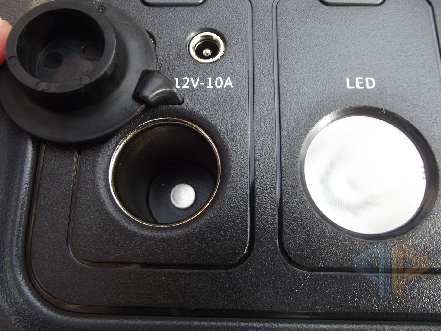 Allerdings gelten die Höchstwerte für alle Anschlüsse zusammen, und die EN700Q hat noch mehr: Zwei 12 V Gleichstrom-Ladebuchsen für DC5521 Hohlrundstecker mit 5.5 mm Durchmesser und ein 12 V-Zigarettenanzünder-Anschluss für den KFZ-Bordstrom sind links auf der Vorderseite zu finden. darüber befindet sich ein Ein/Aus-Schalter für diese drei Ausgänge mit einer blauen LED. Die 12-V-Bordstromdose ist mit einem Gummideckel vor Fremdkörpern oder Fingern als einziger Anschluss geschützt.