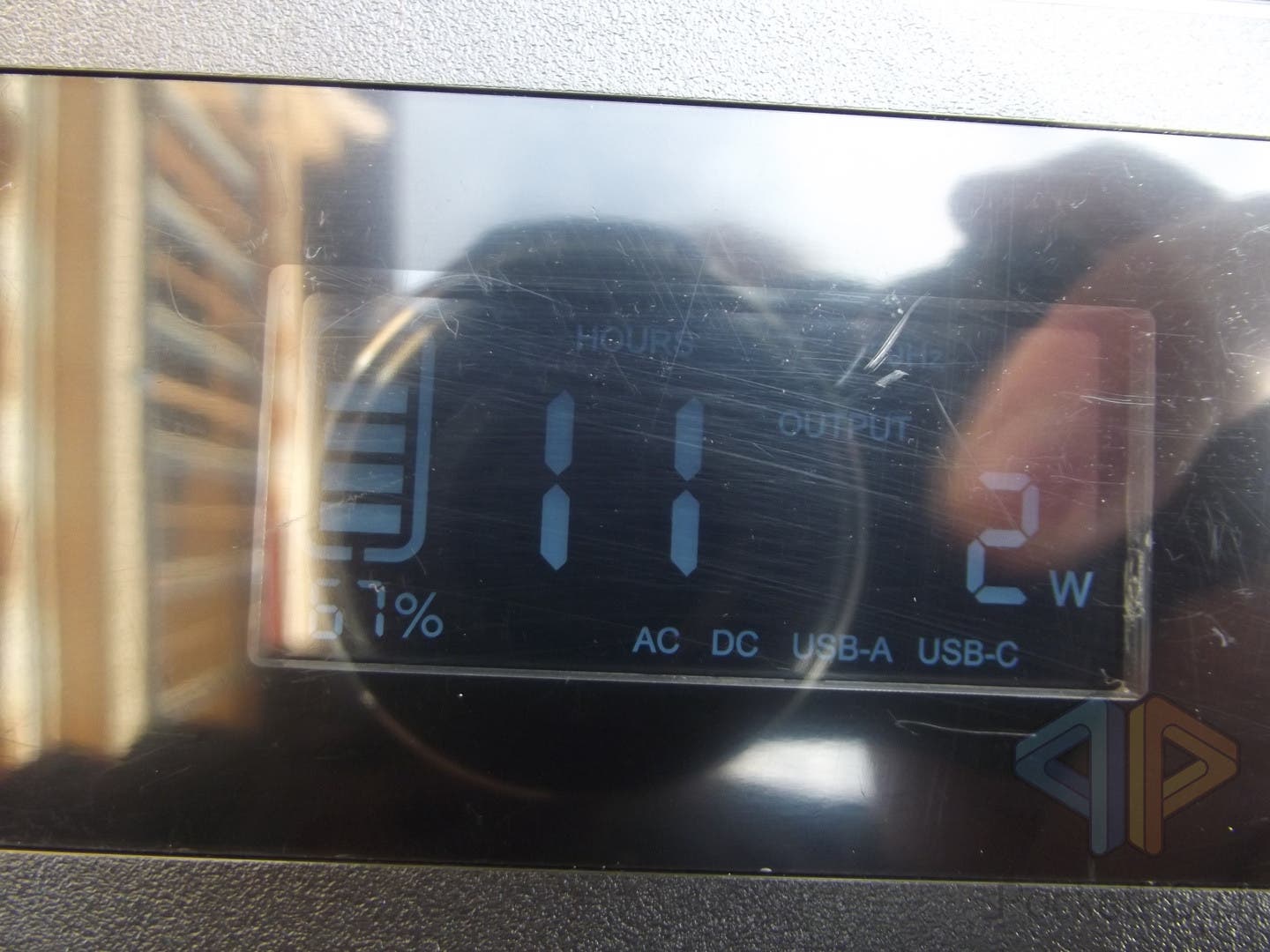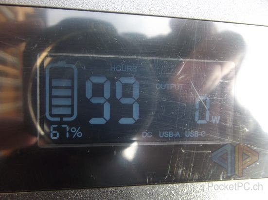 Über den drei rechten Gleichstrom-Anschlussgruppen auf der Vorderseite befindet sich ein weiss-schwarzes LCD mit blauer Hintergrundbeleuchtung. Darauf ist nicht nur die Akkukapazität mit dem bekannten, hier fünfgliedrigen, Batteriesymbol sowie einer Prozent-Anzeige zu finden. Daneben wird auch die voraussichtliche verbleibende Betriebszeit in Stunden oder Minuten zweistellig digital angezeigt, abhängig vom derzeitigen Verbrauch.