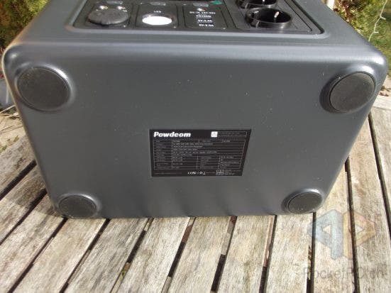 Die Unterseite weisst vier grosse Gummifüsse und ein Typenschild mit den Kenndaten des Energiepakets auf. Der Hersteller gibt für den Akku eine Lebensdauer von mehr als 3000 Ladezyklen und eine Betriebstemperatur von 0 – 50 °C beim Aufladen und -5 °C bis 65 °C beim Entladen an.