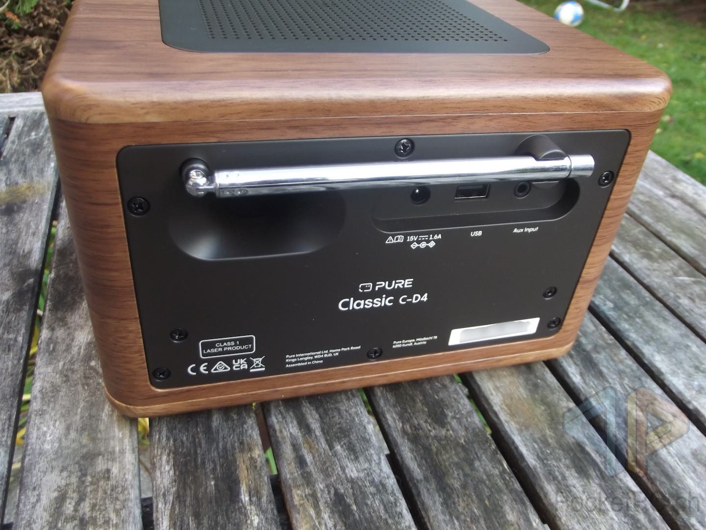 Auf der Rückseite ist der von Pure Audio bereits gewohnte Bass-Ausgang zu sehen, die Teleskopantenne für den Radioempfang sowie der Stromeingang, ein USB-A-Anschluss sowie ein 3.5-mm-Stereoklinken-Eingang. Das mitgelieferte Netzteil bietet 15 V und maximal 1.6 A also 24 Watt an Leistung auf und hat eine Kabellänge von 1.8 Meter.