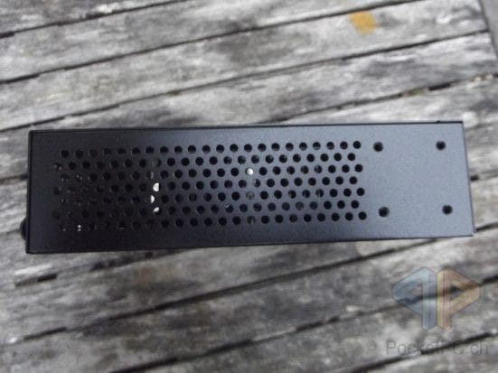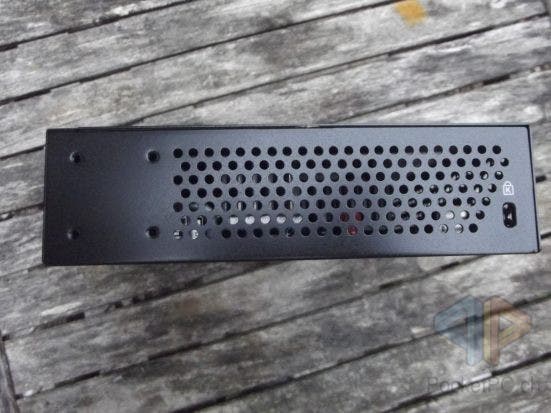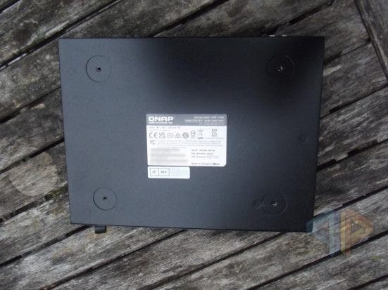 Links der Ports, unter dem Herstellernamen QNAP und der Typbezeichnung QSW-L3205-1C4T sind nochmals PWR in Grün und LOOP in Orange zu sehen, wobei die LED unter der schwarzen Abdeckung des Ethernet Switchs verbaut sind. Sie sind nur sichtbar wenn sie leuchten. Selbiges gilt für den SFP+ Port, der rechts von den fünf RJ45-Anschlüssen zu finden ist. Er nimmt handelsübliche Enhanced Small Form-Factor Pluggable Module auf, eben SFP+, die bis zu 6 Gbit/s bis 32 GBit/s bieten können. Diese Module sind für Fiberglas-Netzverbindungen üblich. Rechts unter den beiden Status-LED ist zudem ein Reset-Taster unter einer Knopfloch-Öffnung verbaut.