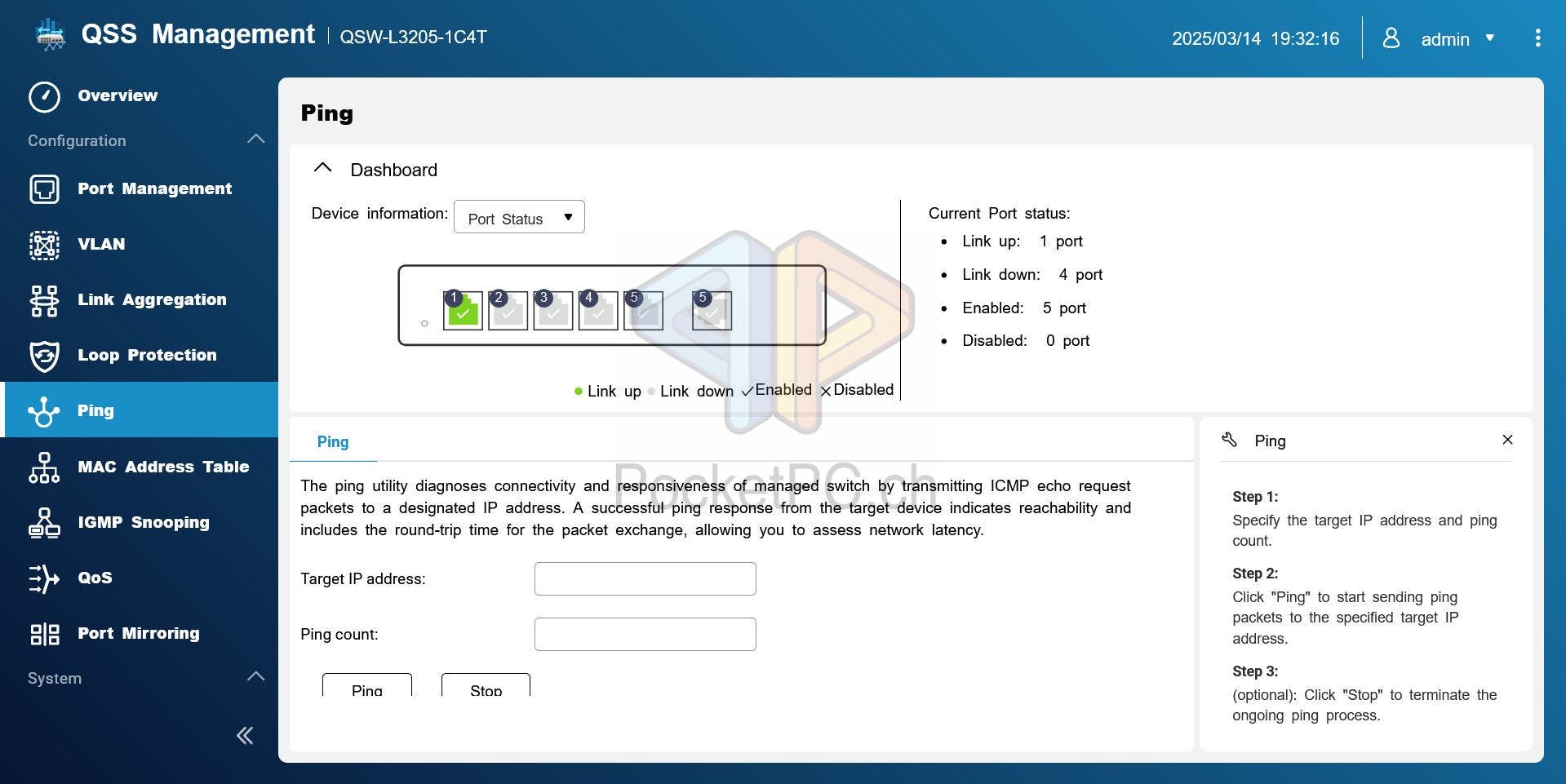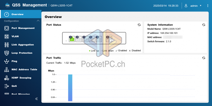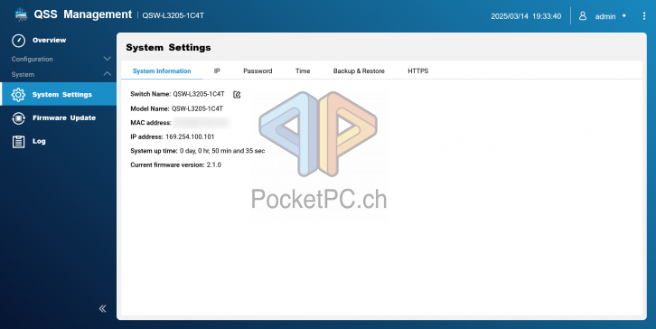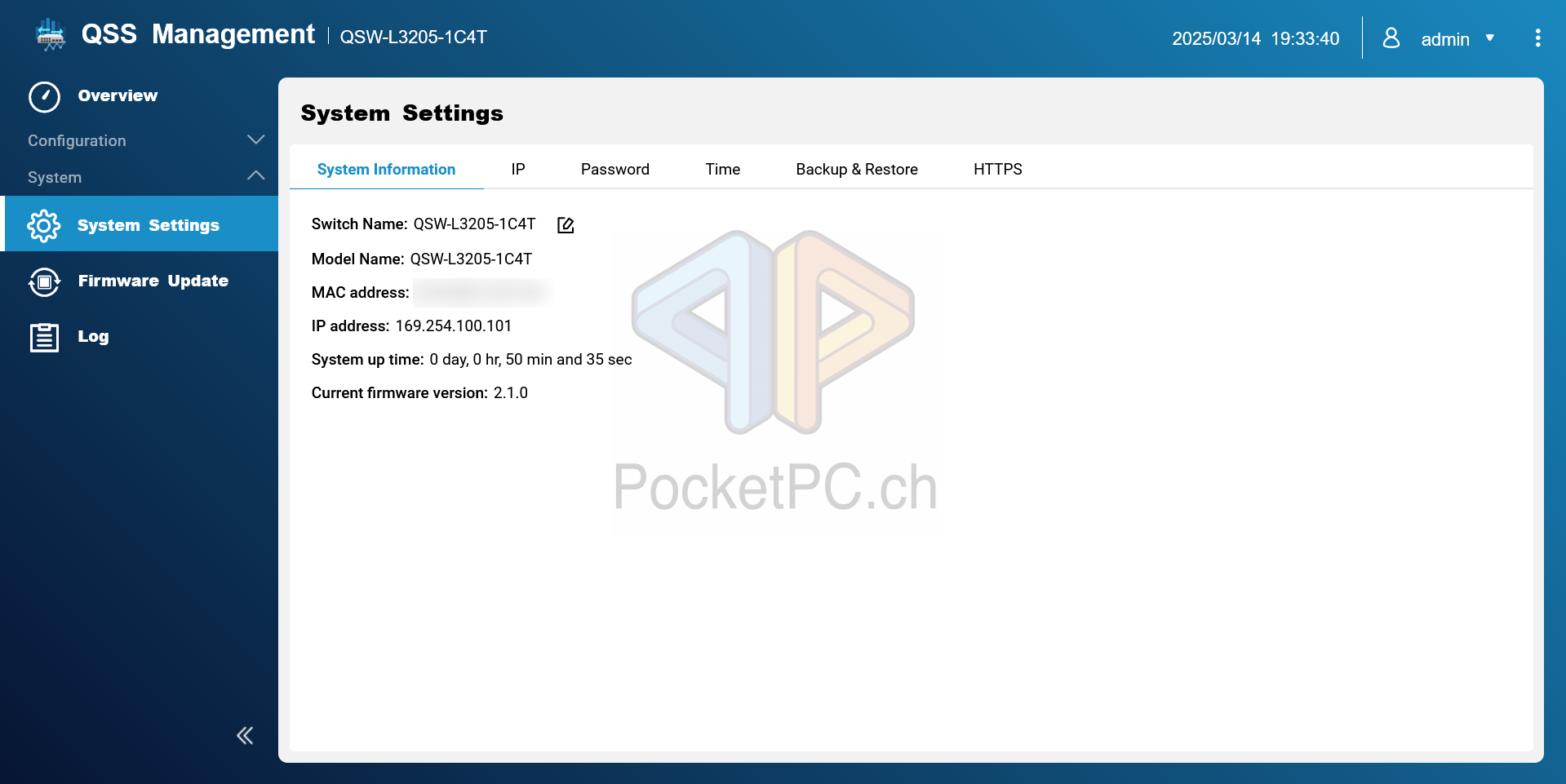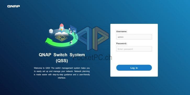 Zum Installieren des QNAP QSW-L3205-1C4T Ethernet Switchs benutzt man entweder die DHCP-Funktion des Routers im Netzwerk, oder verbindet sich zur Standardadresse 169.254.100.101 per Browser. Dabei wird sowohl HTTP als auch HTTPS unterstützt. Wer die IP-Adresse des Switchs nicht kennt, kann mit dem Programm Qfinder Pro für Windows oder MacOS das Gerät suchen, so wie bei QNAP NAS auch.
