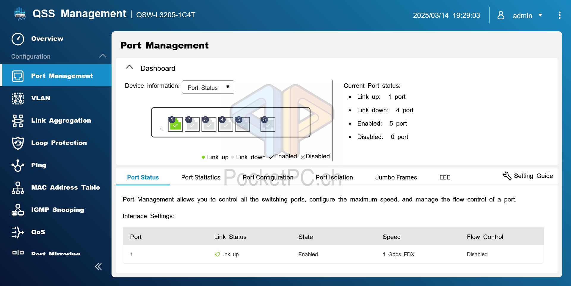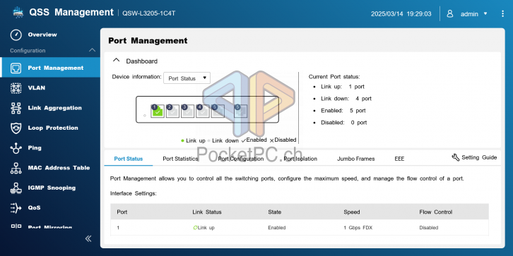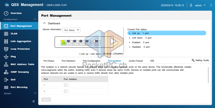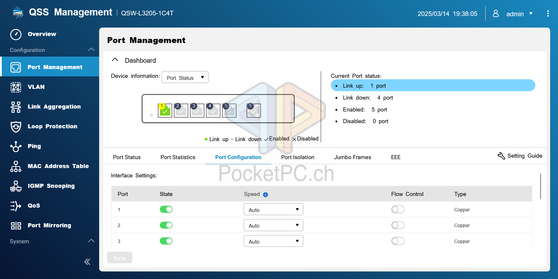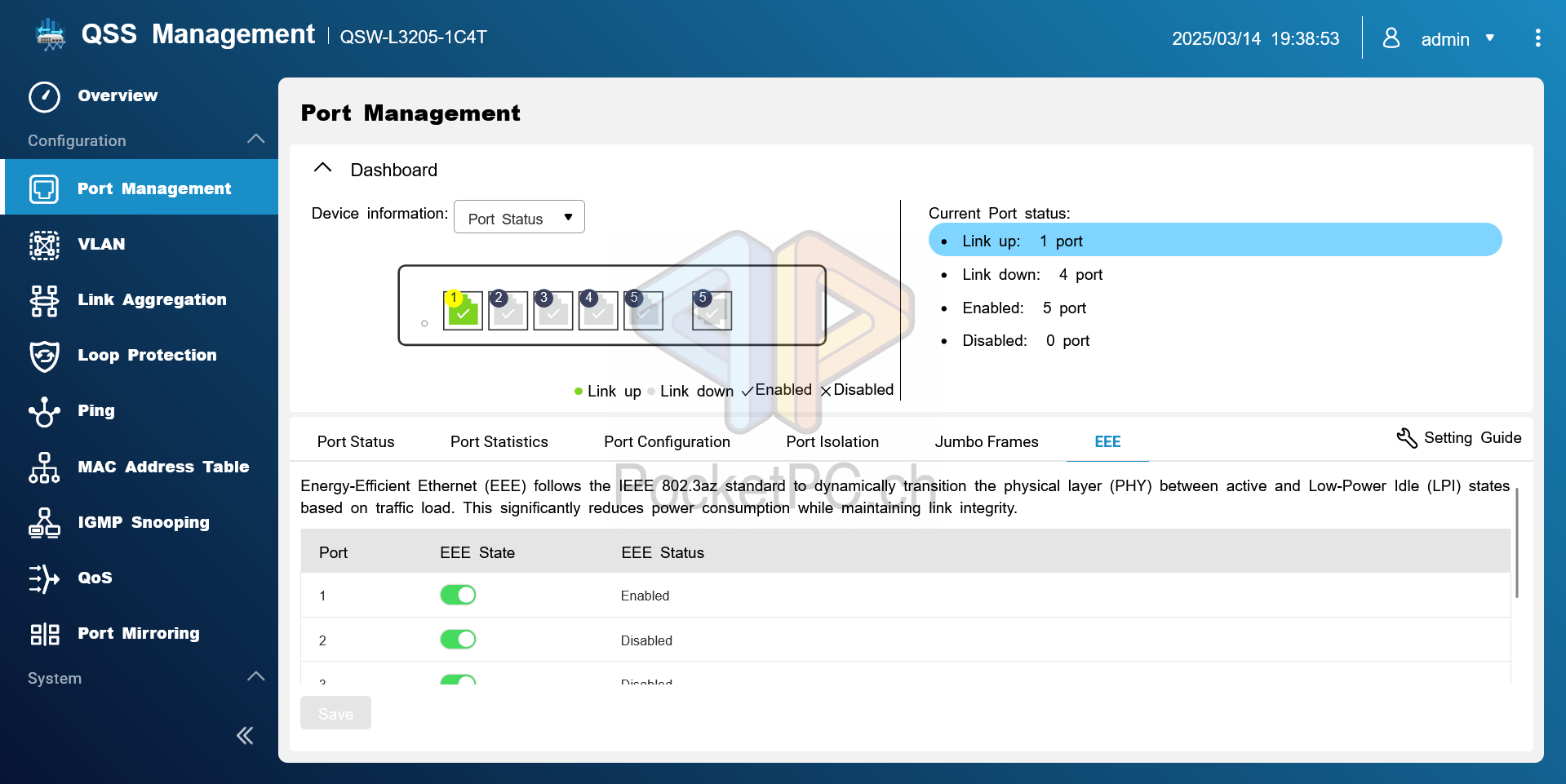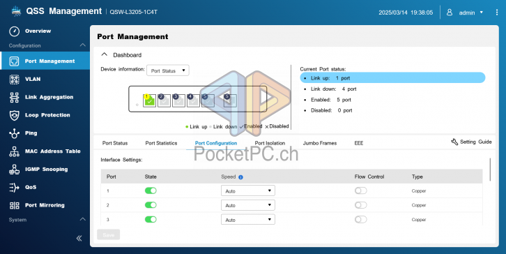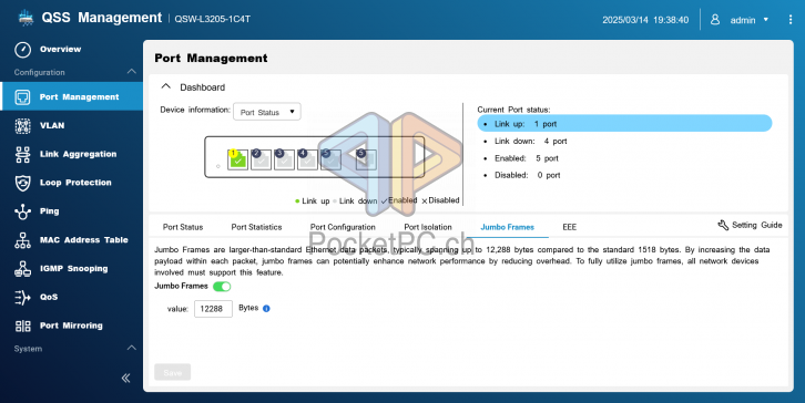 Klar können auch die Systemeinstellungen wie der NTP-Server und die Uhrzeit, das Passwort und die IP-Adresse per Browser konfiguriert werden. Zudem können über das QSS Web-Interface die Firmware aktualisiert sowie die Einstellungen gesichert und wiederhergestellt werden. Die EEE-Energiespar-Funltionen werden ebenfalls für jeden Port einzeln konfiguriert und bewirken, dass der jeweilige Transceiver in einem Schlafmodus wartet, wenn kein Traffic ansteht. Bevor Daten kommen, wird er durch ein entsprechendes Signal geweckt. Dafür müssen aber beide Seiten des Ethernet-Kabels den Standard IEEE 802.3az unterstützen. Sonst funktioniert der Switch von QNAP wie jeder andere und alle Ports sind ständig aktiv. Das gilt auch für den SFP+ Port, der Energy Efficient Ethernet auch unterstützt.