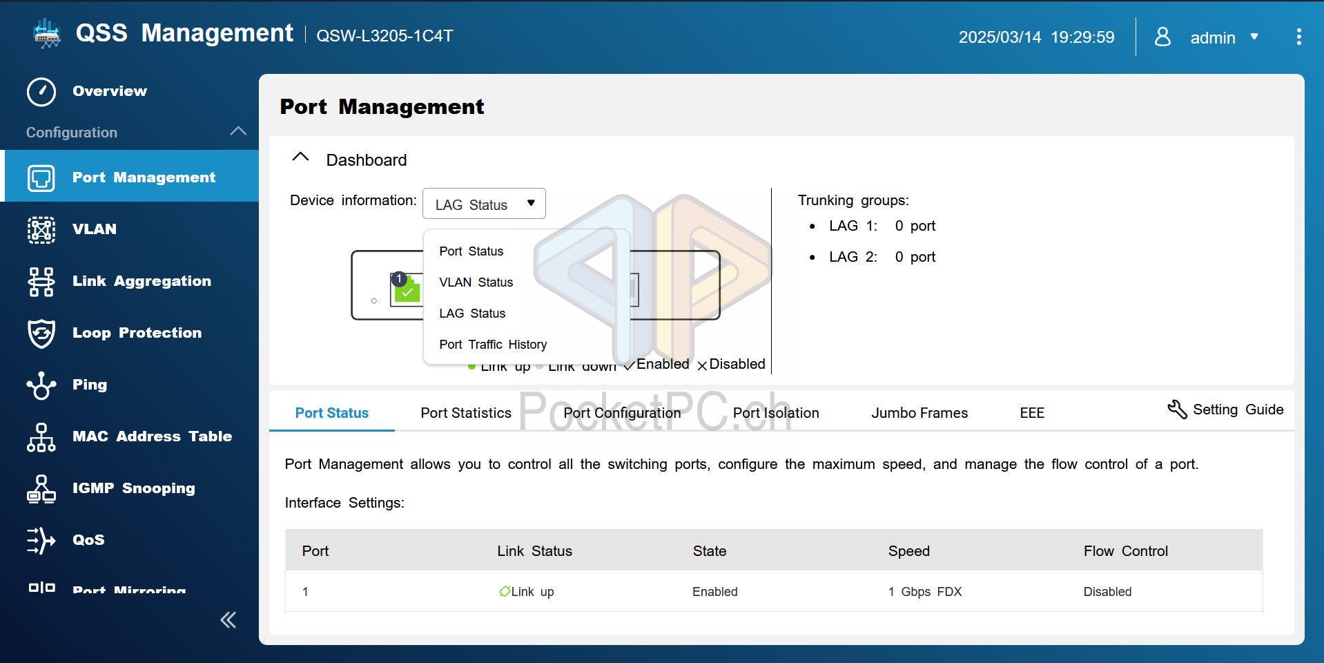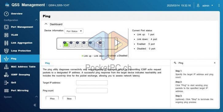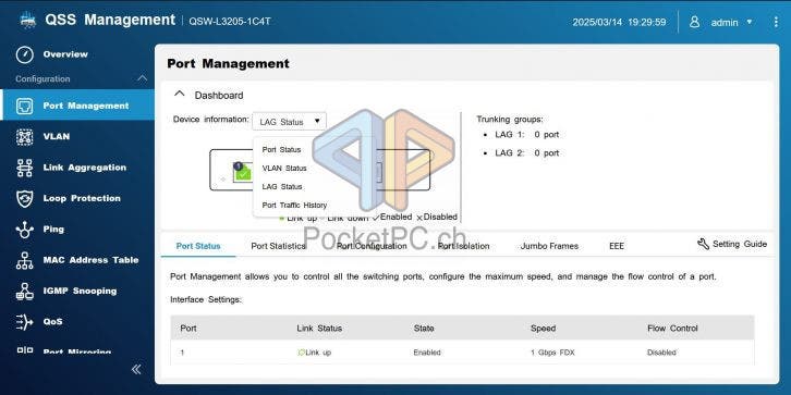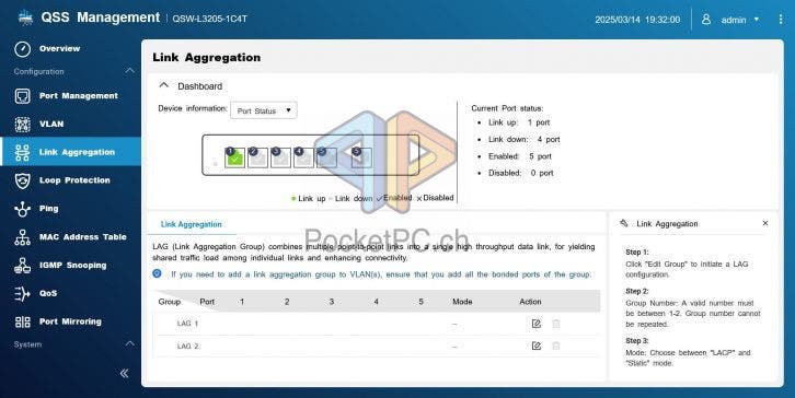 Anschliessend präsentiert sich das QNAP Switch System genannte Betriebssystem im Browser-Fenster. Dies ist responsiv, allerdings nicht wirklich für Smartphone-Bildschirme ausgelegt. Hier kann nun aber mit einfachen Mausklicks jeder Port einzeln konfiguriert und überwacht werden. Auch Link-Aggregation, also das zusammenführen von mehreren Ports zu einem sowie VLAN zum Unterteilen wird hier problemlos unterstützt und ist einfach einzurichten. Jede Funktion des rein englischsprachigen Web-Interfaces auf dem QNAP Ethernet-Switch kommt mit einer Setting Guide genannten Kurzhilfe daher. So wird schnell deutlich, welche Informationen wie eingegeben werden sollen.