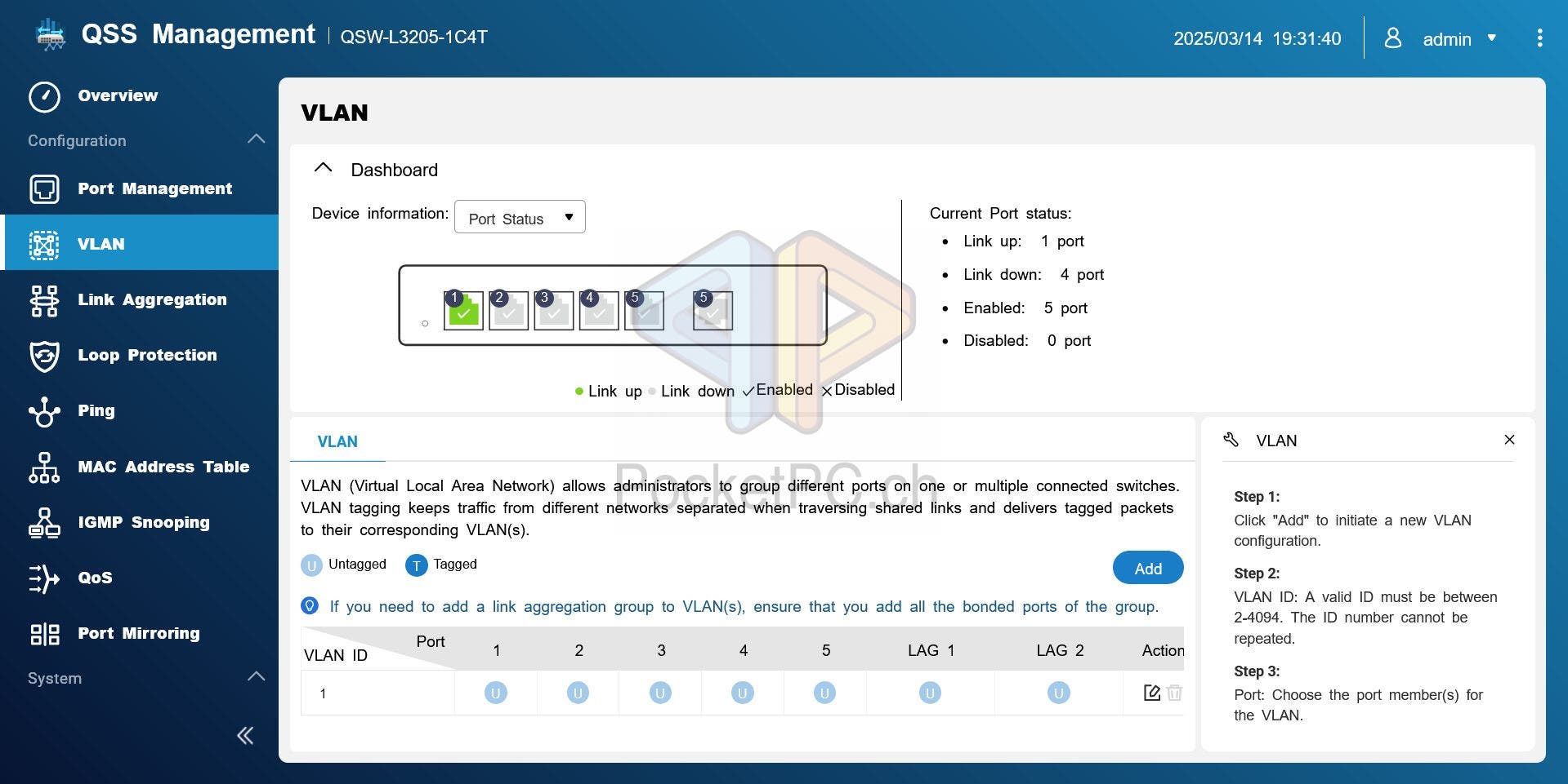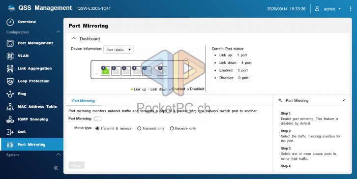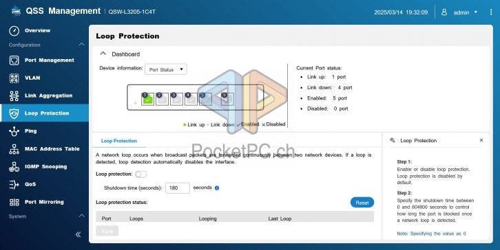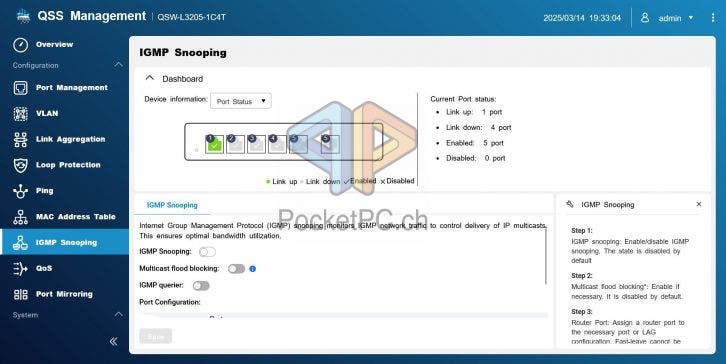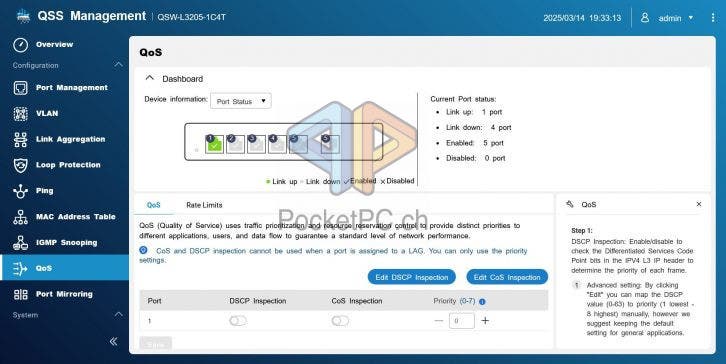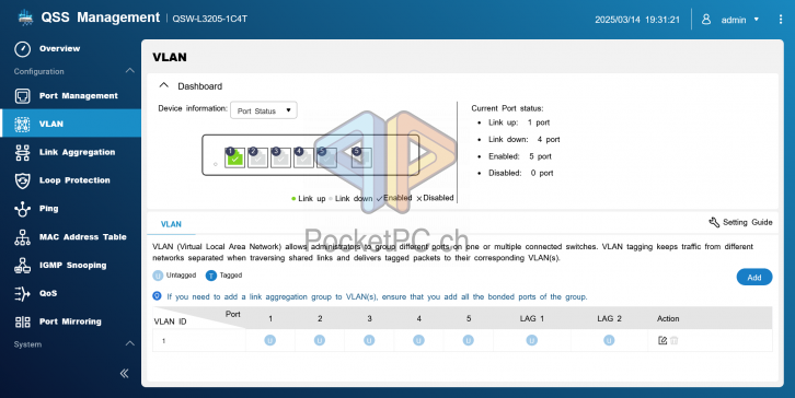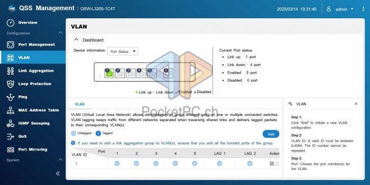 Für die VLAN-Unterteilung eines Netzwerks unterstützt der QNAP QSW-L3205-1C4T allerdings nicht nur IEEE 802.1Q, also das Taggen von Traffic an einem bestimmten Anschluss. Auch MAC-basiertes VLAN oder PVID gibt es. Port Mirroring und die Loop-Erkennung können ebenfalls eingestellt werden im QSS.