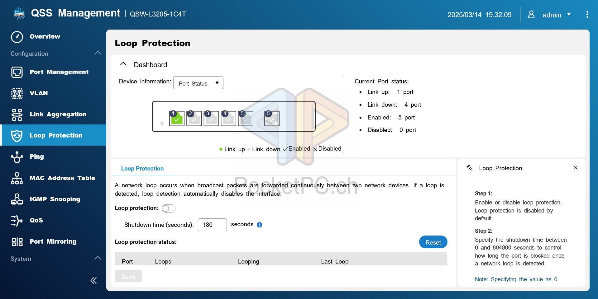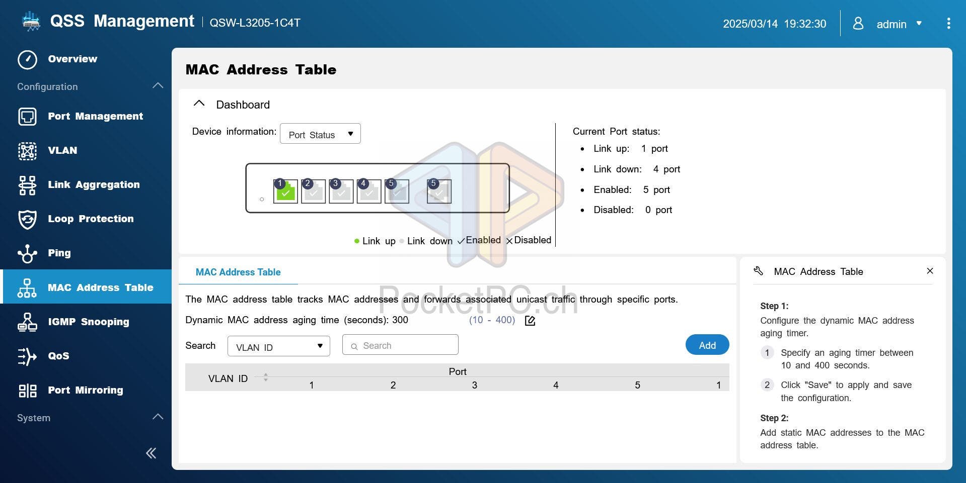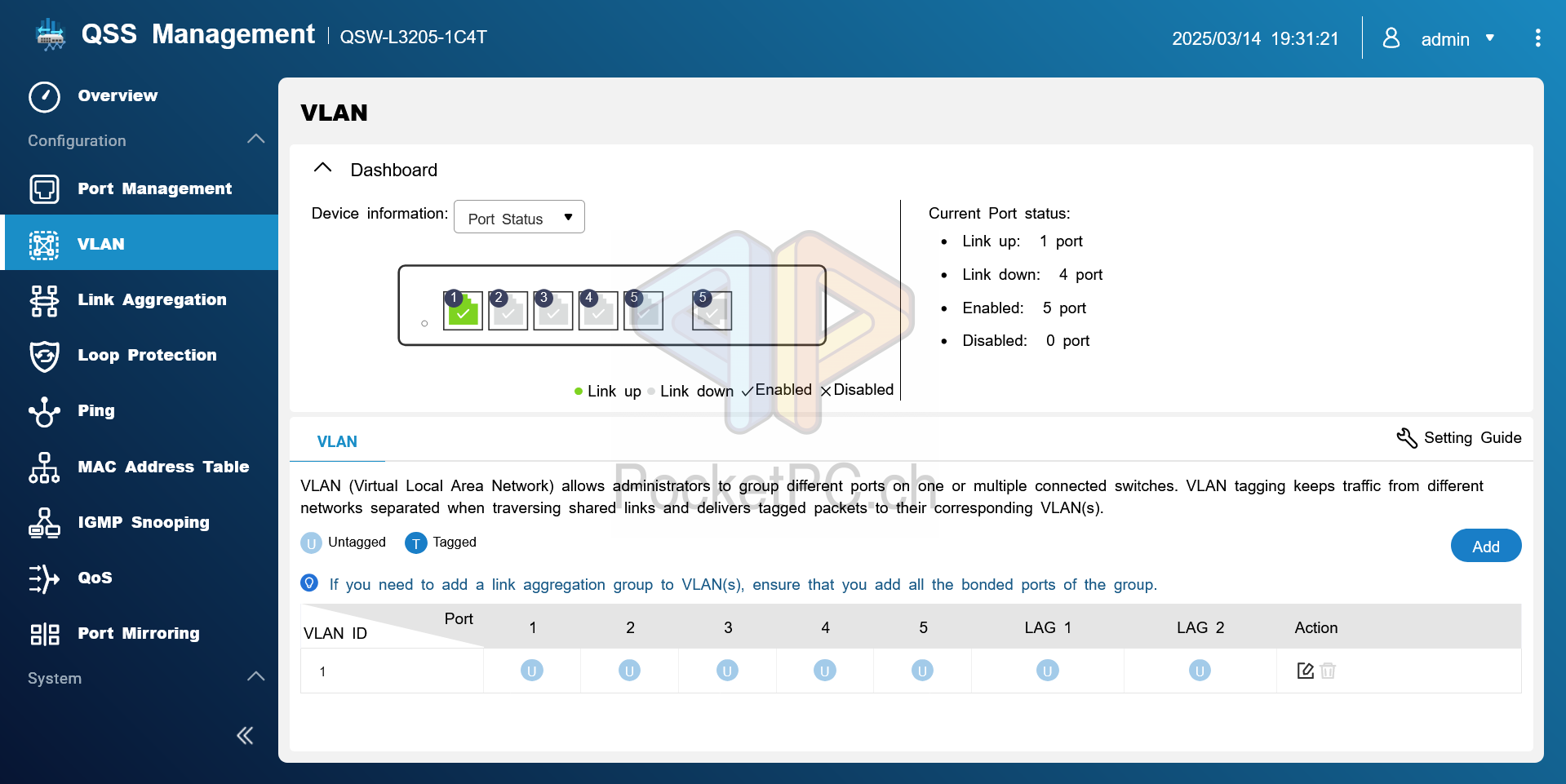 Für die VLAN-Unterteilung eines Netzwerks unterstützt der QNAP QSW-L3205-1C4T allerdings nicht nur IEEE 802.1Q, also das Taggen von Traffic an einem bestimmten Anschluss. Auch MAC-basiertes VLAN oder PVID gibt es. Port Mirroring und die Loop-Erkennung können ebenfalls eingestellt werden im QSS.