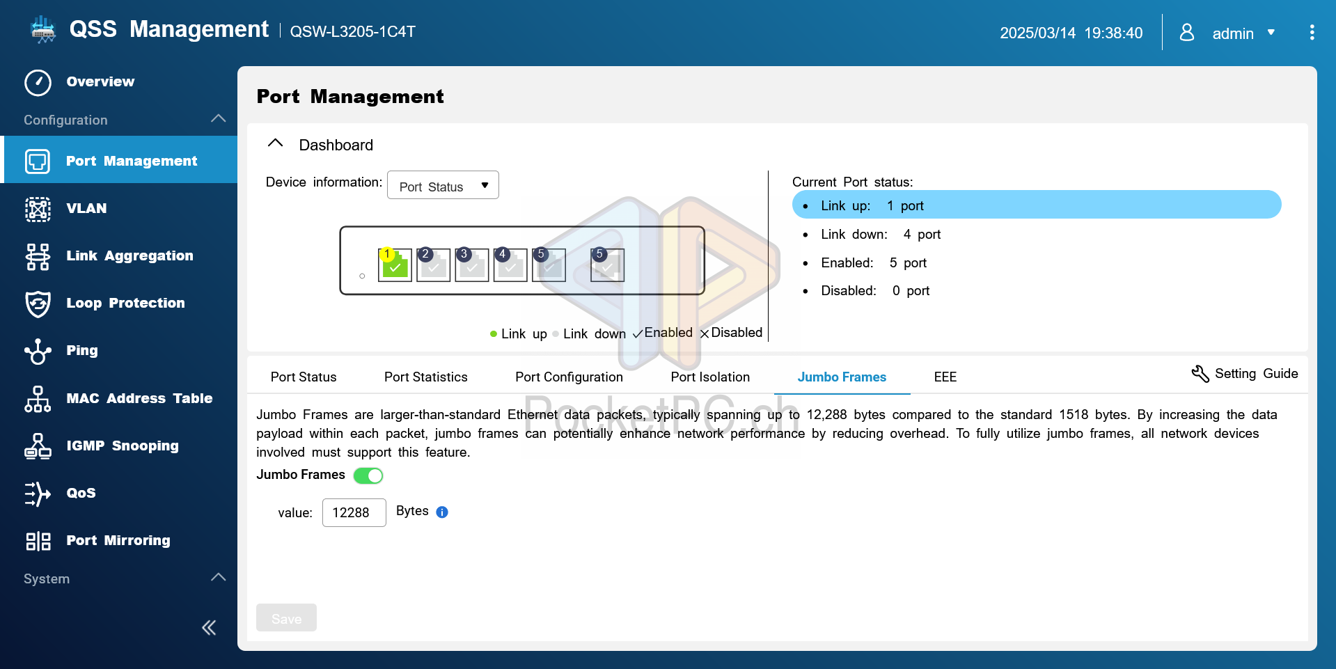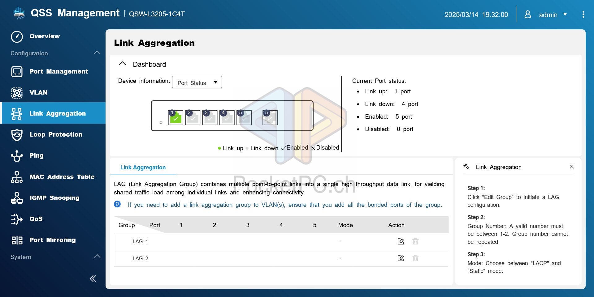 IGMP Snooping wird ebenfalls im Browser konfiguriert und Jumbo Frames bis 12K können konfiguriert werden, was insbesondere für IPTV-Anwendungen hilfreich sein kann. Link Aggregation (LACP) sorgt dafür, das bis zu zwei Ports gleichzeitig mit bis zu 20 Gbit/s genutzt werden können, um ein Gerät besonders Effizient ans Netz anzubinden. Das grössere Gerät QSW-L3208-2C6T kann indes bis zu vier Ports zusammenschalten und so 40 Gbit/s liefern.